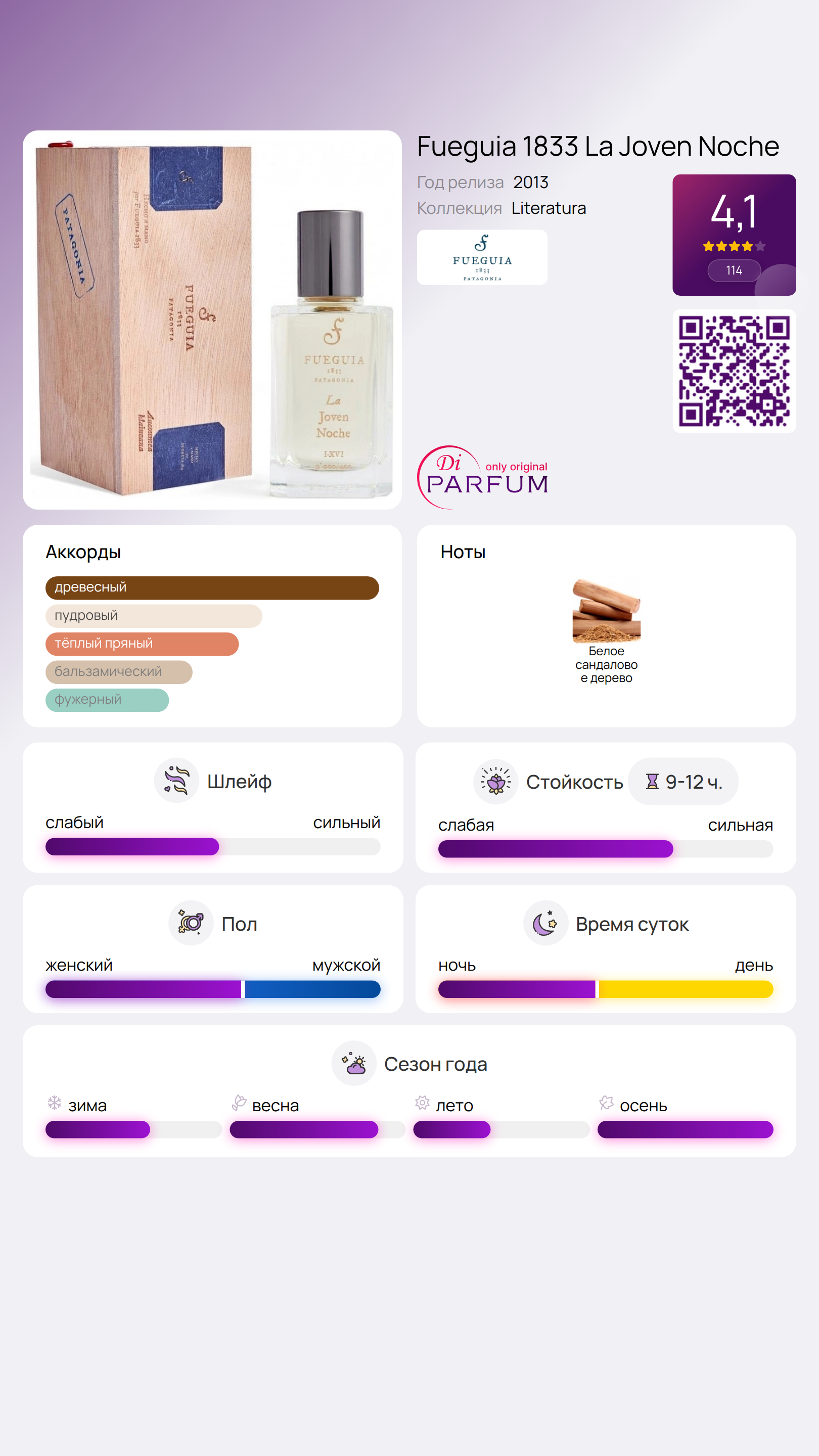 La Joven Noche от Fueguia 1833 — это уникальный древесный аромат, созданный как для женщин, так и для мужчин. Этот парфюм был представлен в 2013 году, а его автором выступил известный парфюмер Julian Bedel.