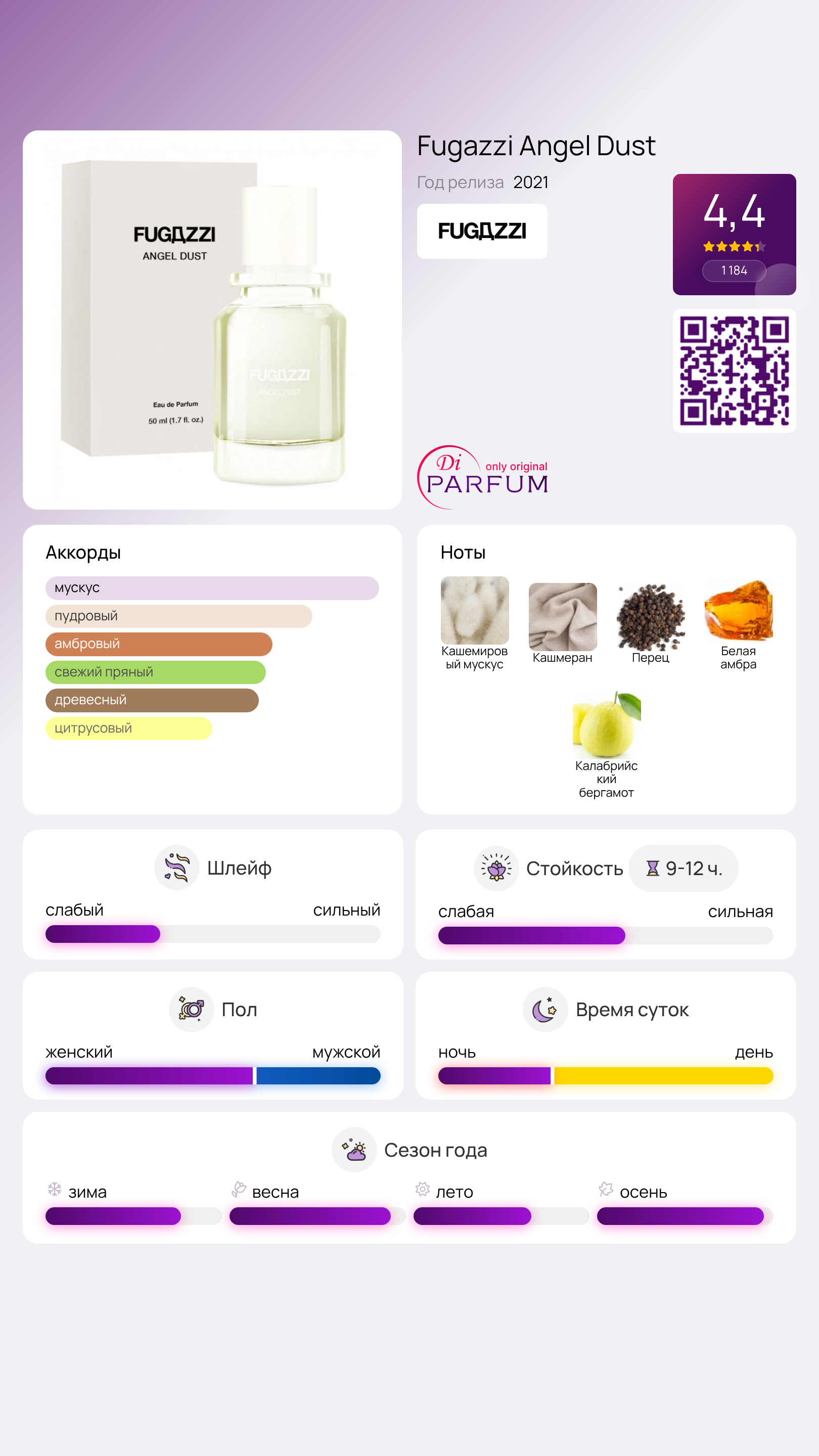 Аромат называют «вежливой молекулой», благодаря его теплым, уютным нотам перца кашмерана и легкой сладости топленого молока. Основой служит свежесть калабрийского бергамота, добавляющая немного цитрусовой свежести. Элегантные древесные аккорды, словно кашемировый свитер светлого оттенка, гармонично сочетаются с естественным запахом кожи. Шлейф раскрывается в виде привлекательного и естественного кокона. Кристаллы белой амбры обещают захватывающее путешествие. Мягкая и сдержанная композиция Angel Dust от Fugazzi представляет собой «высокодуховное вознаграждение» для уверенных и уравновешенных женщин и мужчин.
