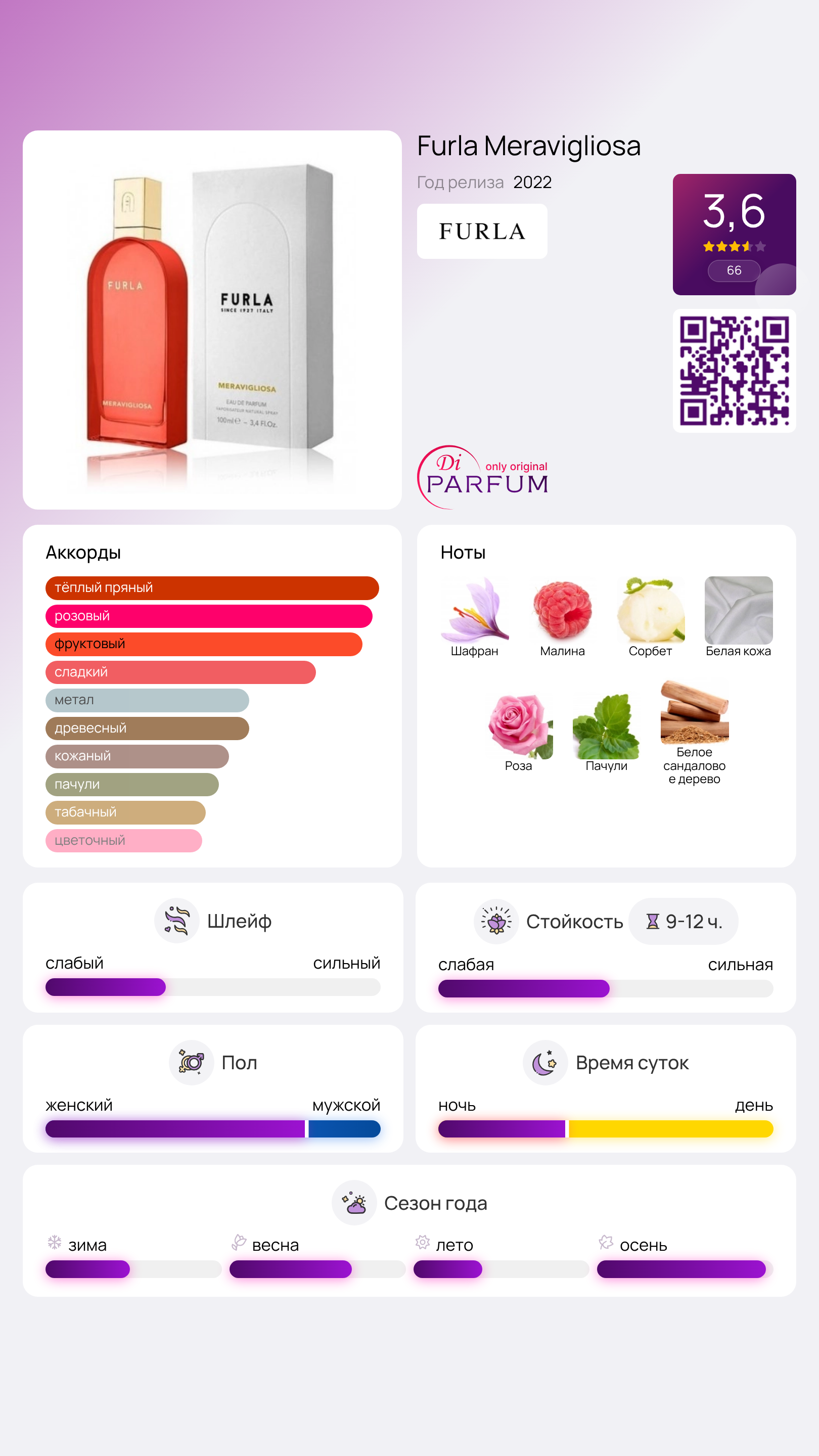Парфюм Furla Meravigliosa представляет собой современный фруктово-пряный аромат, который прекрасно отражает разнообразие и многогранность женской сущности. Вдохновение для создания этого парфюма пришло из яркой и уникальной белой кожи, которая гармонично переплетается с нотой свежей малины, в виде насыщенного сорбета.