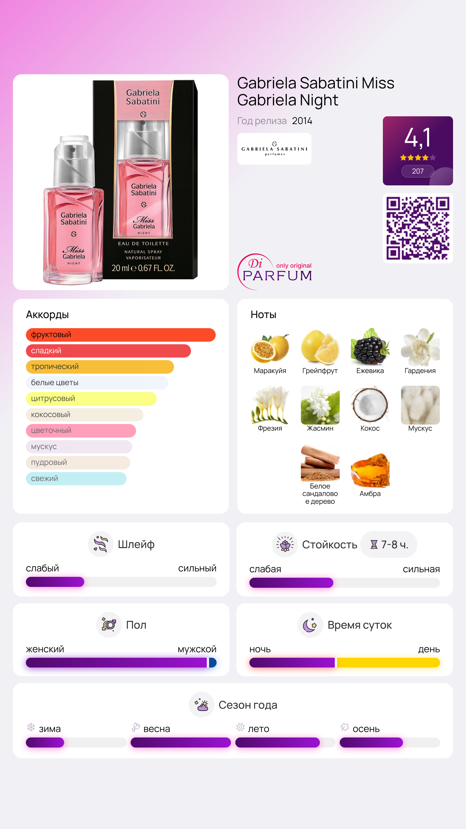 Композиция Gabriela Sabatini Miss Gabriela Night – это молодежный цветочно-фруктовый аромат, представляющий собой вечерний фланкер своего предшественника и передающий атмосферу веселья и ночной жизни. Он ассоциируется с игривой чувственностью, позитивной энергией и радостью. Эта туалетная вода, как волшебный наряд, окутывает свою обладательницу чувством уверенности в своей привлекательности и готовностью к новым ярким приключениям.