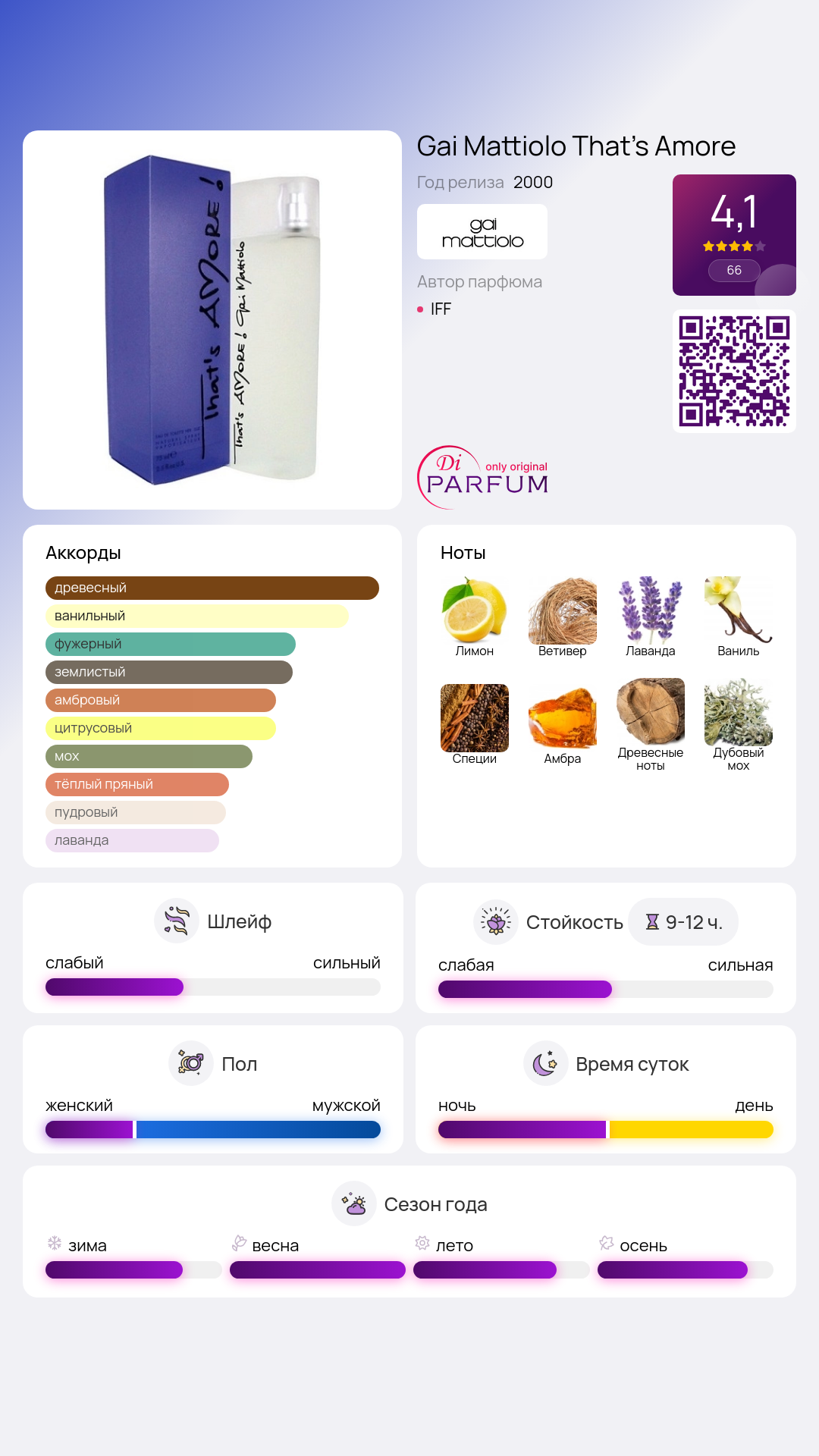 Помогают в этом цветочные и фруктовые акценты, которые пронизаны мягкой сладостью древесно-ванильных оттенков. That's Amore — это признание в любви, не требующее слов. Аромат обладает чувственностью, передавая это качество своей обладательнице. Он также дает возможность создавать уникальный и запоминающийся стиль.