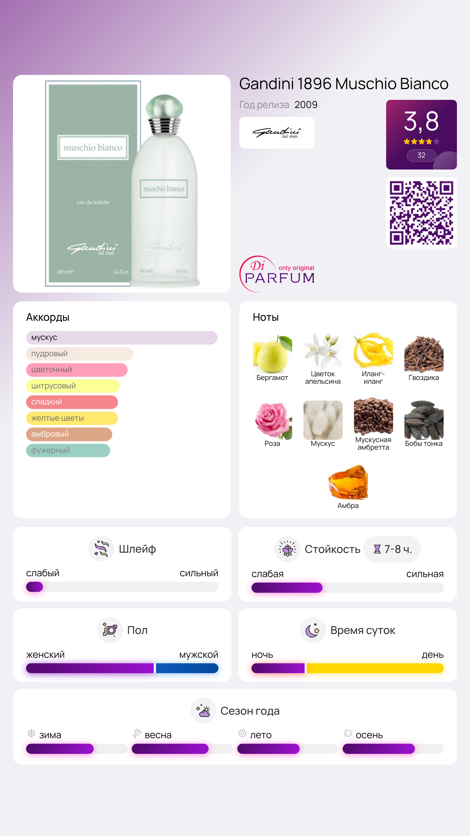 В шлейфе аромата преобладает мягкий белый мускус, дополненный соблазнительной янтарной амброй. Уникальность создают также дымные ноты бобов тонка, усиливающие волшебство соблазна. Выпущенная итальянским брендом в 2009 году, туалетная вода входит в "мускусную" коллекцию из восьми ароматов. Muschio Bianco от Gandini 1896 – это выбор для тех, кто ценит насыщенные ориентальные духи и ищет нечто особенное.