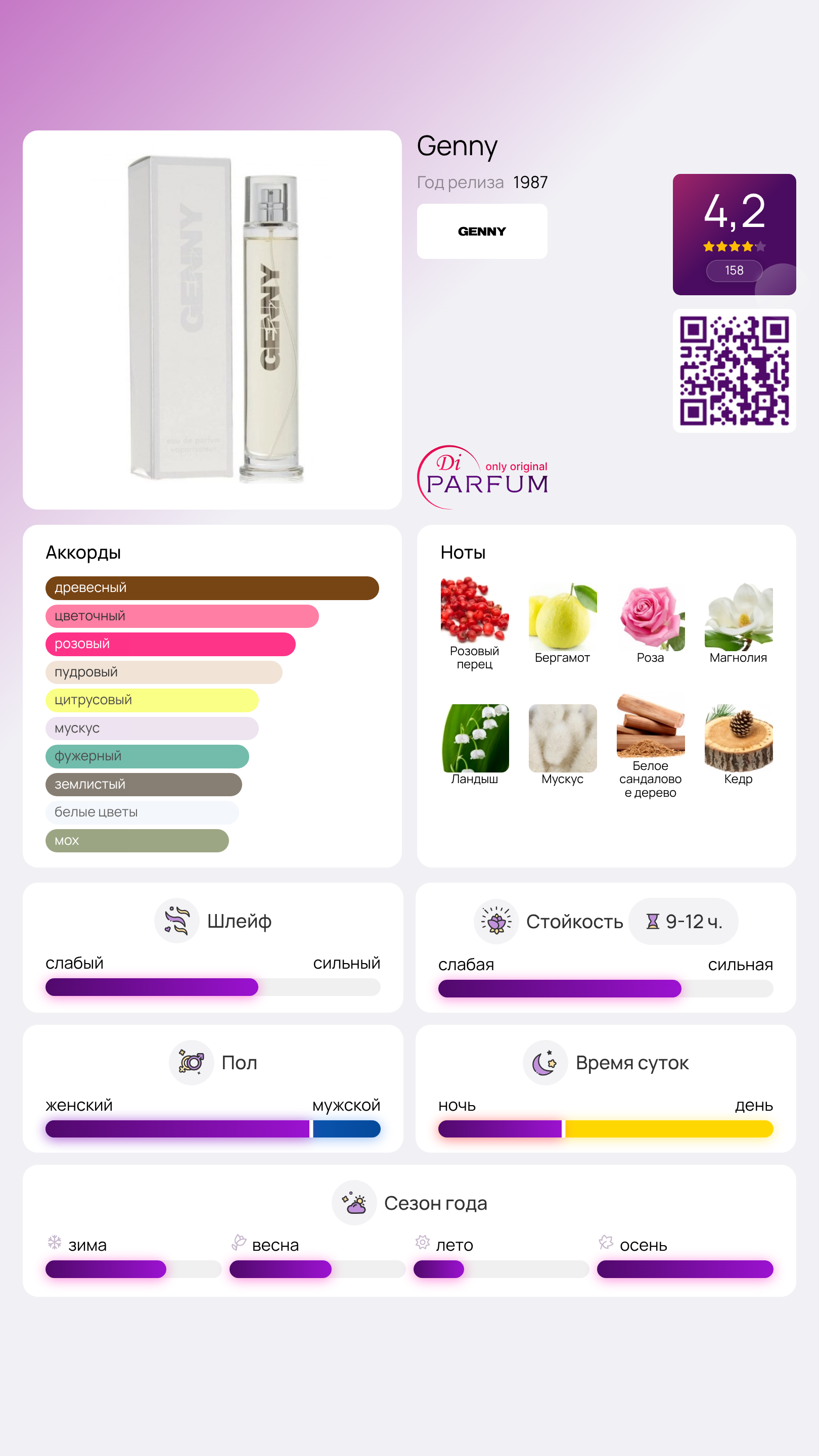 Аромат Genny начинается с ярких, свежих нот ревеня и бергамота из Италии, дополняемых листьями фигового дерева и черной смородины. В сердцевине раскрываются нежные и выразительные оттенки розы, магнолии и лилии, а базу композиции составляют кедр, индийский сандал и фиговое дерево. Позвольте этому аромату стать вашей мелодией, и он точно привлечет внимание к вашей личности!