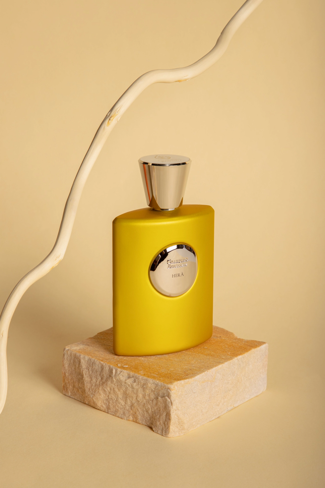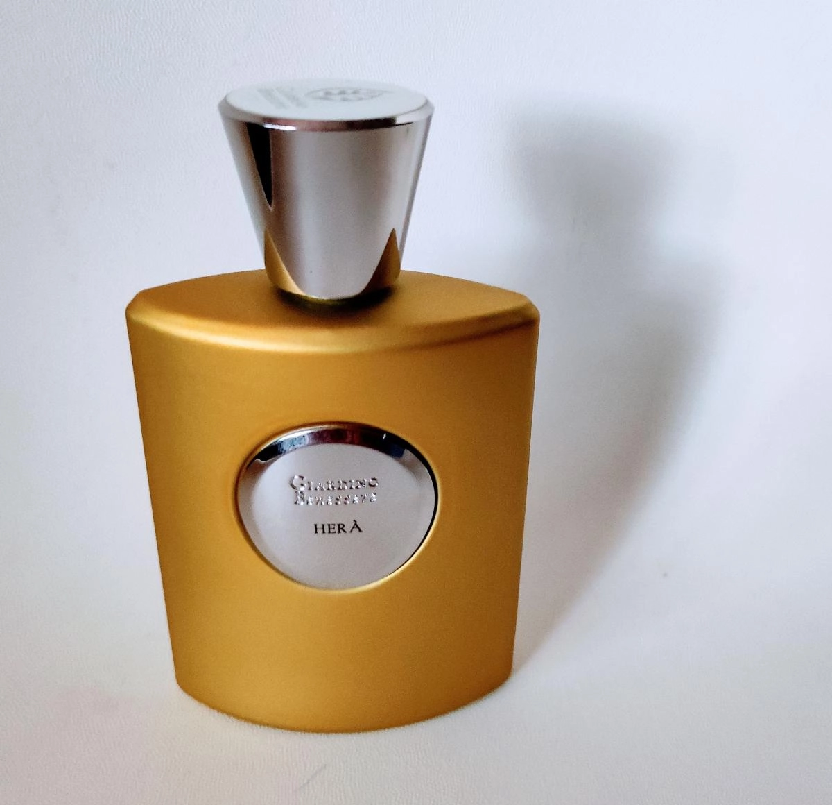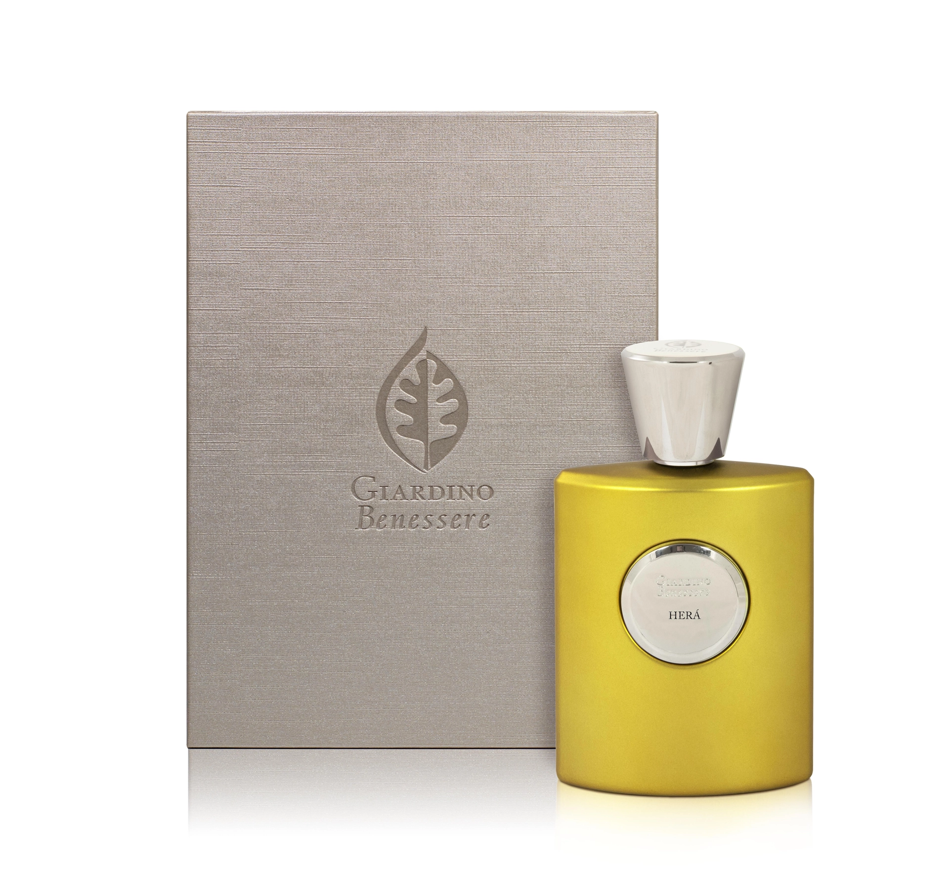 Композиций Hera от Giardino Benessere впервые появилась в 2023 году и стала частью роскошной коллекции Titans. Итальянский бренд позиционируется как «более доступный» проект Паоло и Тициана Terenzi, вдохновение для которого было почерпнуто из древнеримских мифов. Металлический флакон золотистого оттенка символизирует первозданную красоту природных ландшафтов.