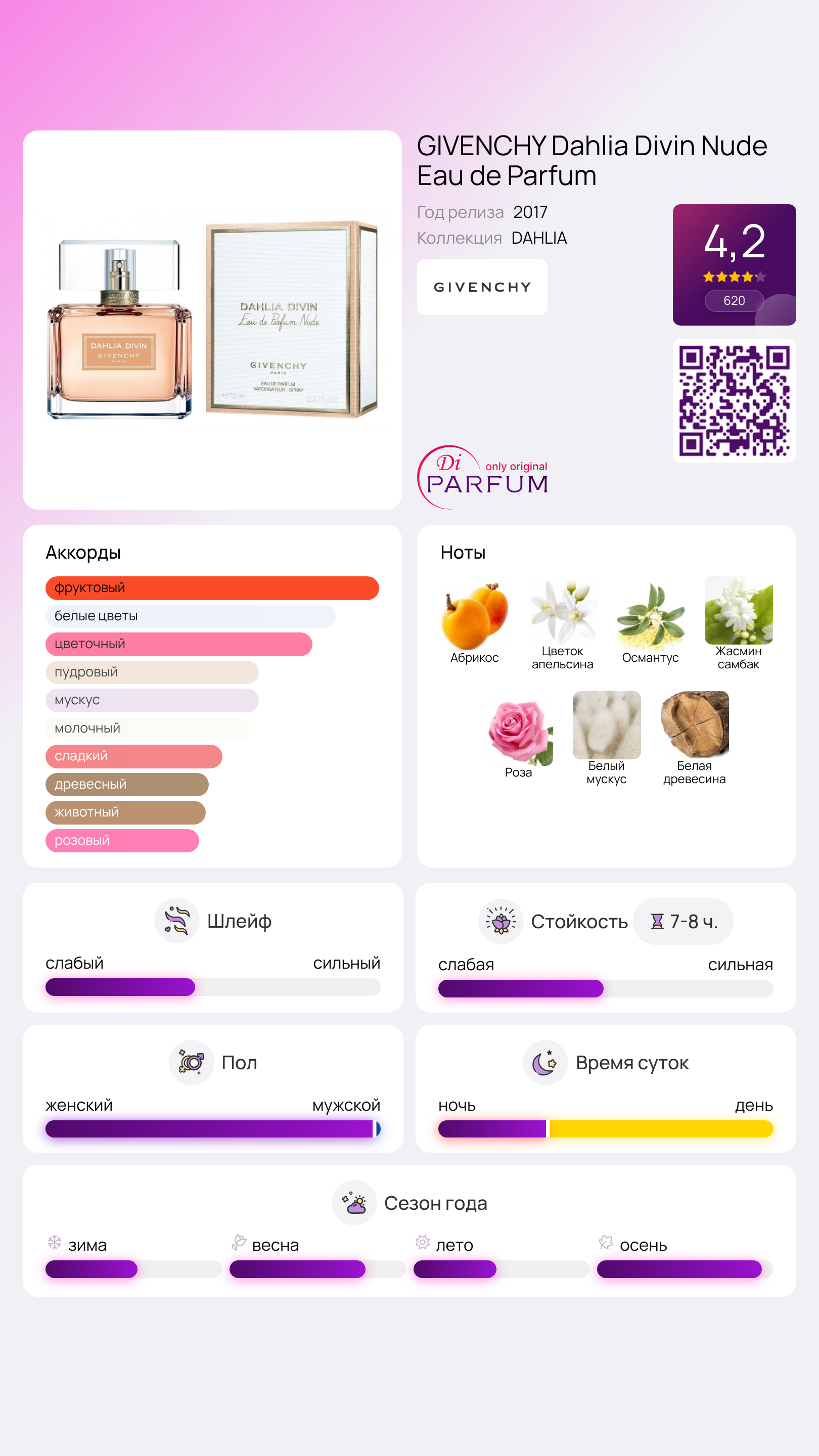 Каждый аромат выполняет свою уникальную функцию, и в случае женской композиции Dahlia Divin Nude Eau de Parfum от Givenchy Parfum, выпущенной в 2017 году, его основная задача заключается в создании нежного фона без резких и вызывающих акцентов.