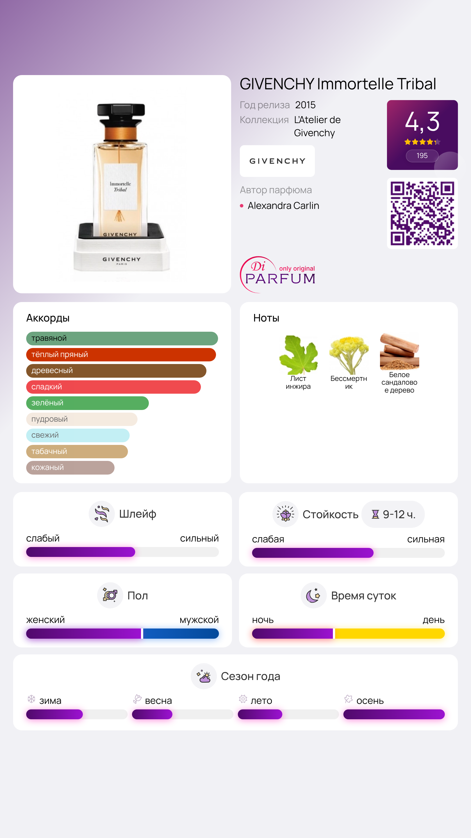 Аромат Immortelle Tribal, с его восточным пряным акцентом, переносит в уникальную атмосферу стран Средиземноморья. Соединение свежести листа инжира и утончённостью сандалового дерева, в сочетании с горьковато-сладкими нотами бессмертника, создает гармонию этнических и современных мотивов из различных культур.
