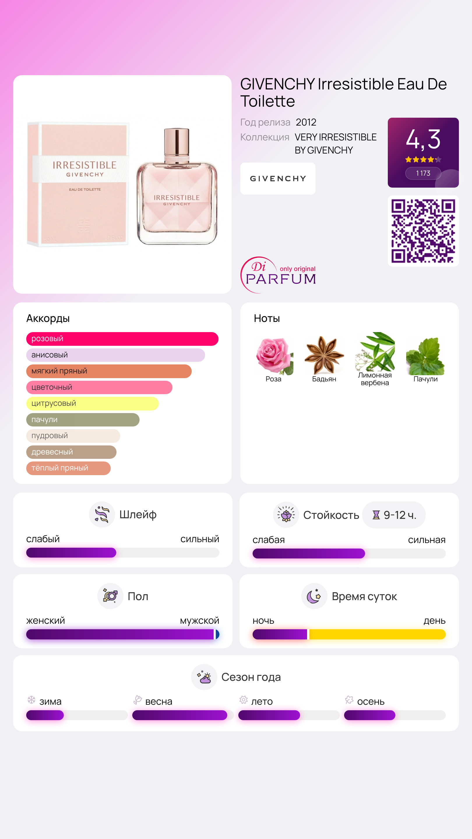 GIVENCHY Irresistible Eau De Toilette - это весенний аромат, насыщенный цветочными и фруктовыми оттенками, который создает атмосферу волшебства и радости. Он воплощает свободу и предназначен для очаровательной женщины. В его композиции переплетаются яркие розовые ноты и нежность мускусного дерева, наполняя чувством жизненной энергии и близости. Эта туалетная вода, выпущенная в 2021 году, стала настоящей жемчужиной линии «Irresistible».