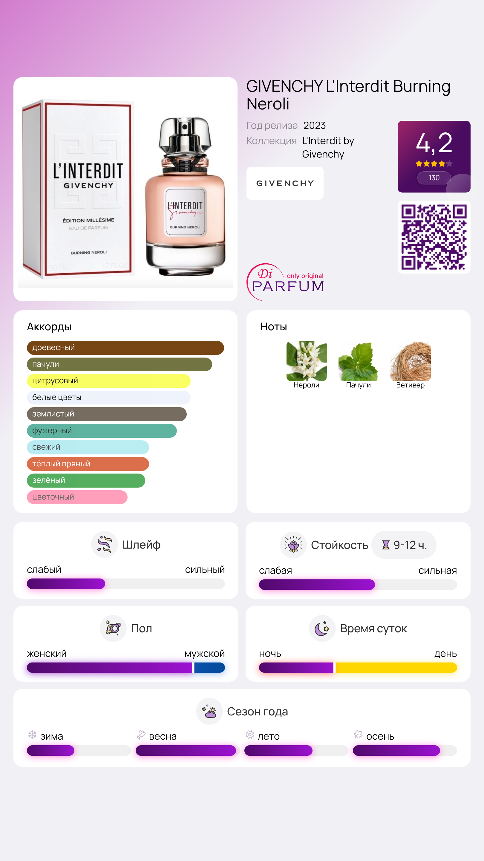 В 2023 году знаменитый модный бренд представил своим фанатам новую ароматическую композицию под названием GIVENCHY L'Interdit Burning Neroli. Флакон сохраняет элегантные линии, а оформление выполнено в традиционном стиле, характерном для этой линии. Однако название вызывает интерес - "горящие нероли", что подчеркивает основное внимание на этих ароматах.