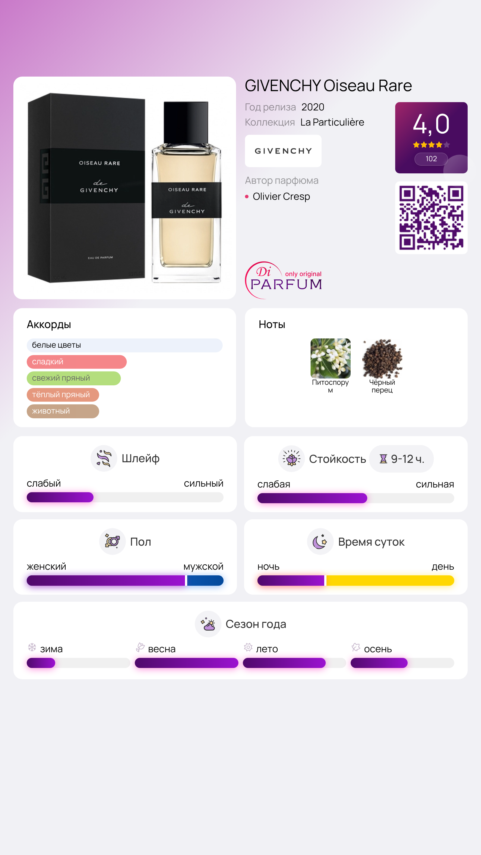 В его ароматической пирамиде выделяются дуэт солнечного цветка и экстравагантного перца, собранного на Шри-Ланке. Выразительный цитрусовый нюанс японского питоспорума гармонично сочетается с остротой цейлонского черного перца. Композиция Oiseau Rare от GIVENCHY раскрывает новые грани индивидуальности своего носителя и впервые была представлена в 2020 году в рамках La Collection Particuliere.