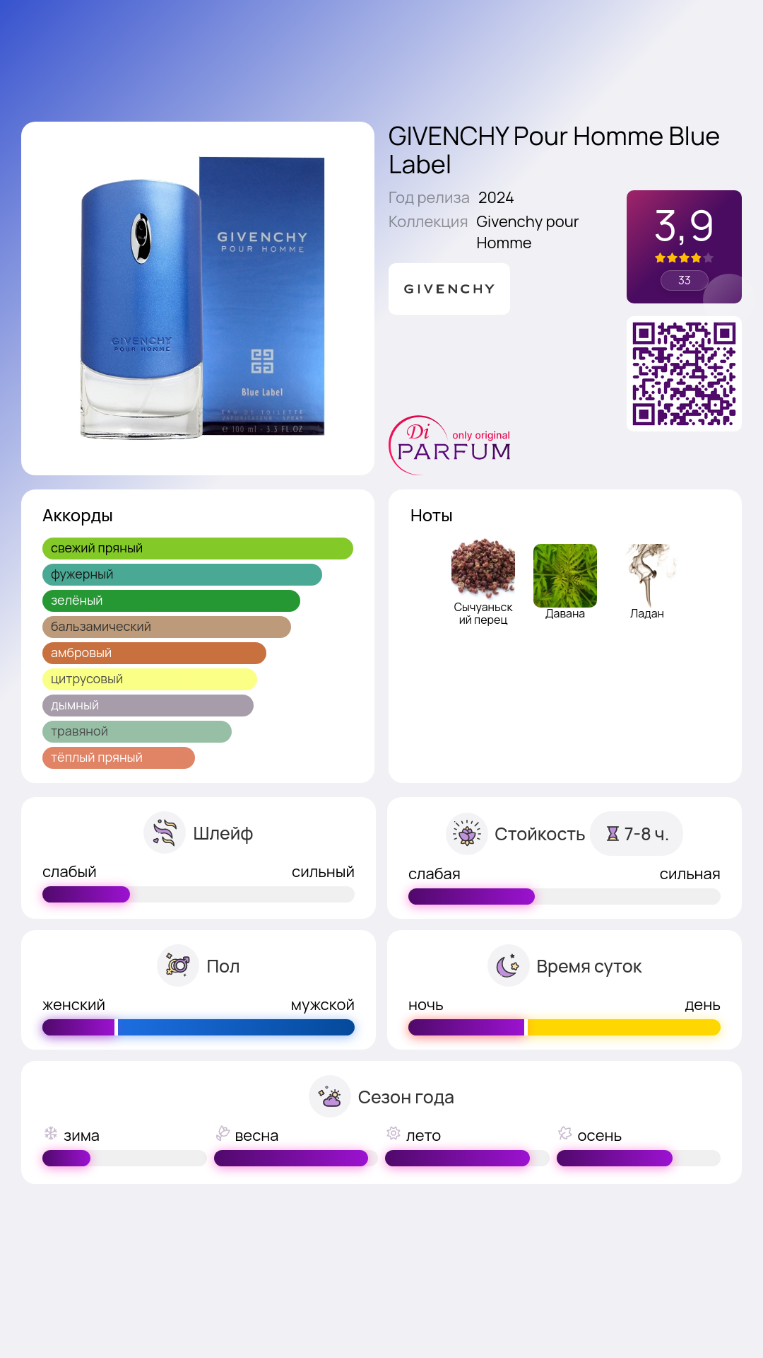 При создании новой мужской ароматики Pour Homme Blue Label, компания Givenchy предложила легкую и свежую интерпретацию своего классического аромата Givenchy Pour Homme. Очарование владельца Pour Homme Blue Label заключено в его естественной простоте и непринужденном стиле.