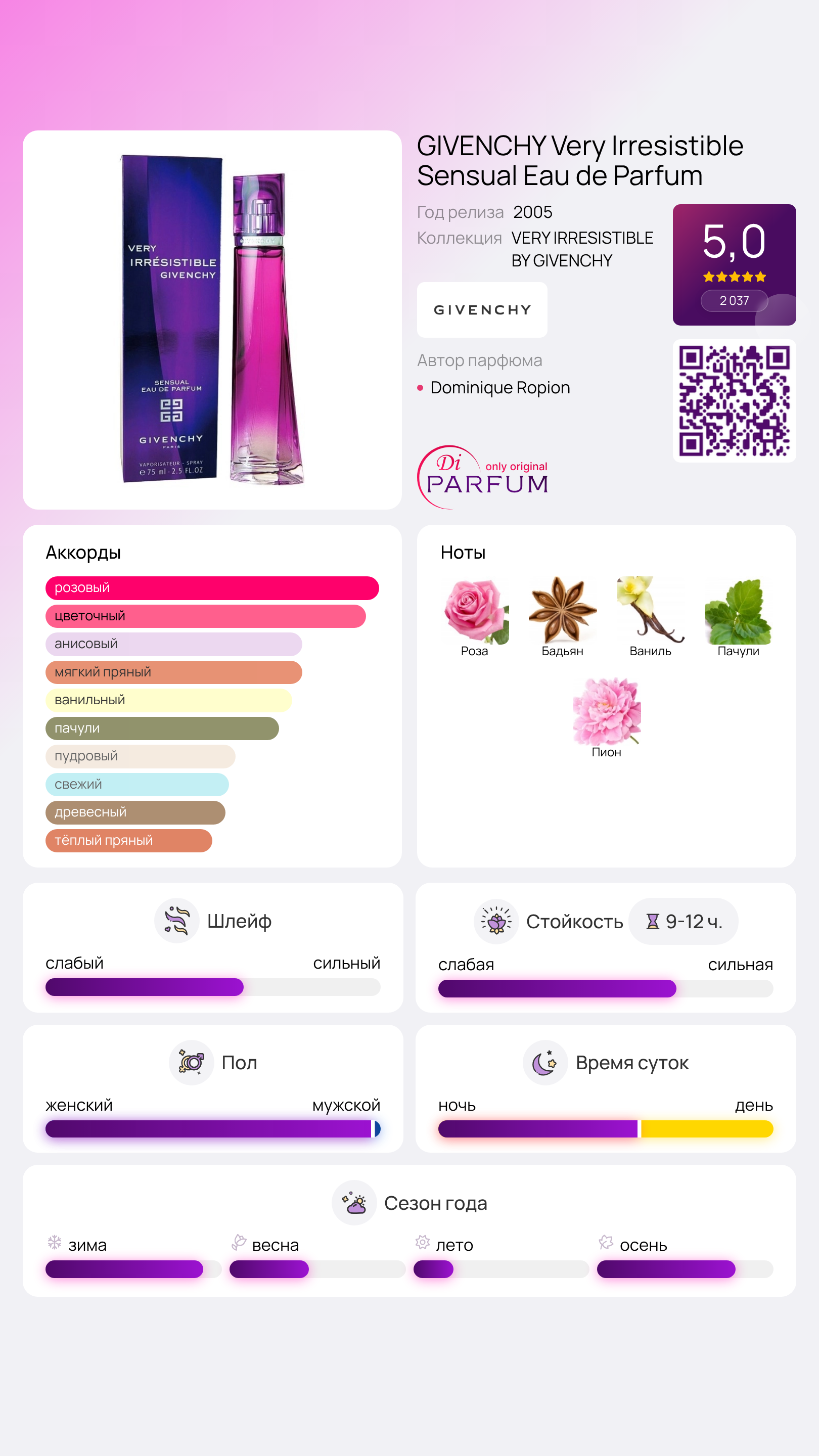 Парфюм Very Irresistible Sensual Eau de Parfum от Givenchy Parfum предлагает более чувственный и насыщенный аромат по сравнению с его предшественником, Very Irresistible. Этот запах идеален для девушек, стремящихся не только дарить свою любовь, но и получать её взамен, делясь своими искренними эмоциями. Такие женщины притягательны своей мягкостью.