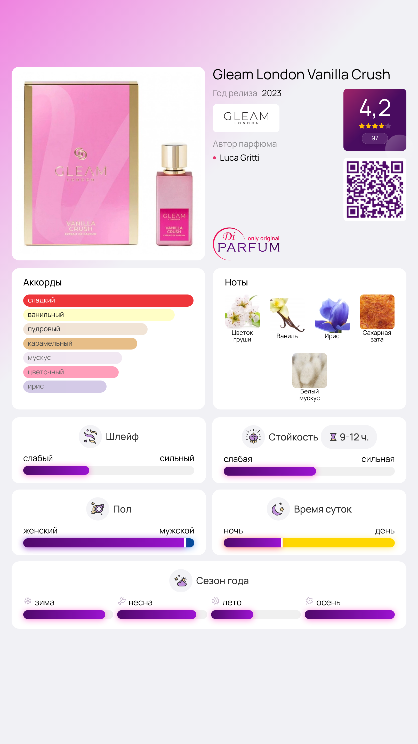 Gleam London Vanilla Crush имеет роскошное и соблазнительное звучание, которое прекрасно дополнит любой образ женщины, добавляя ему яркости, привлекательности и запоминаемости.