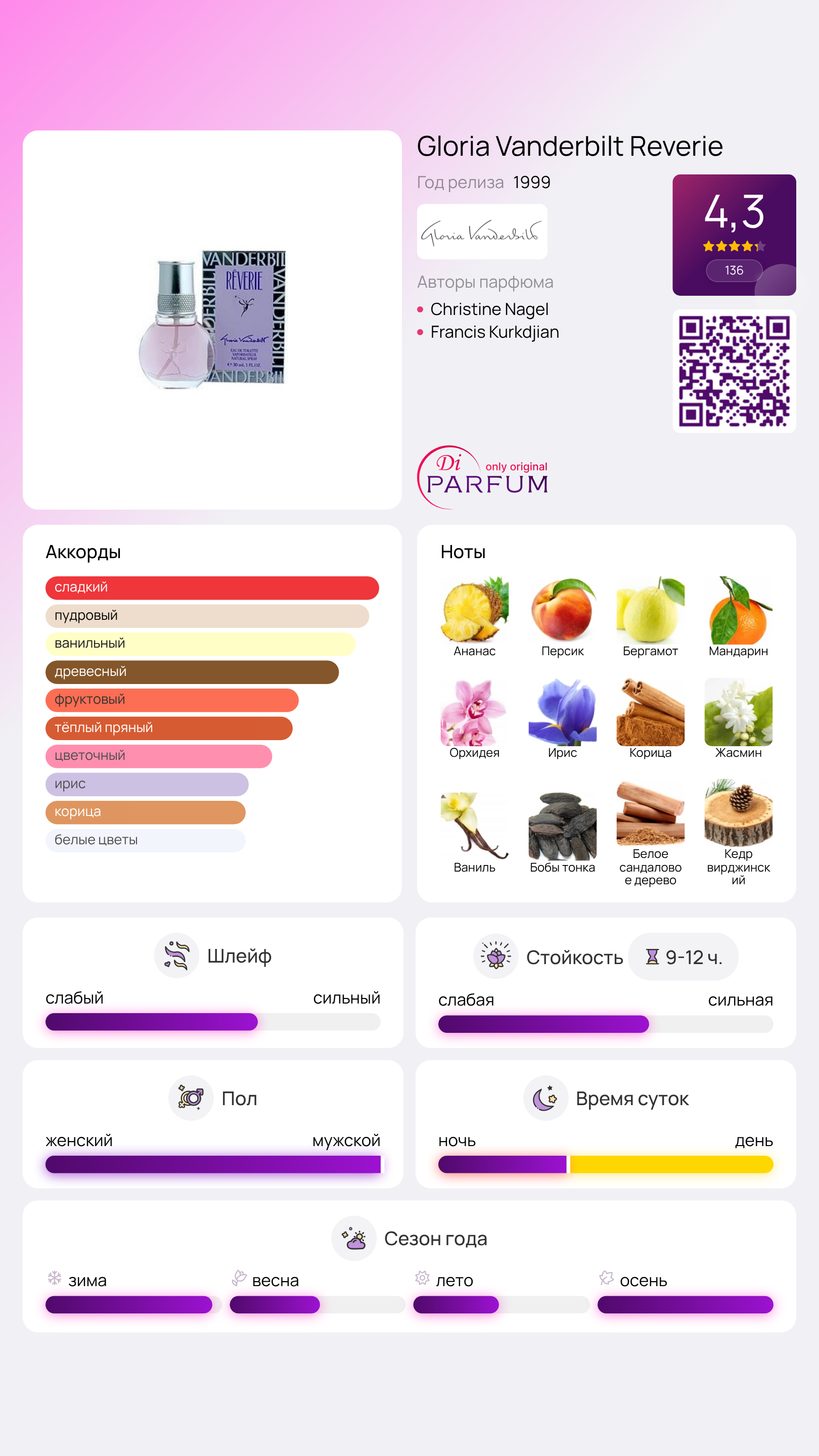 Аромат Gloria Vanderbilt Reverie был запущен в 1999 году, но до сих пор сохраняет свою популярность и актуальность. Он станет отличным выбором для женщин с утонченной и мечтательной натурой. Этот парфюм добавит в образ привлекательности и загадочности.