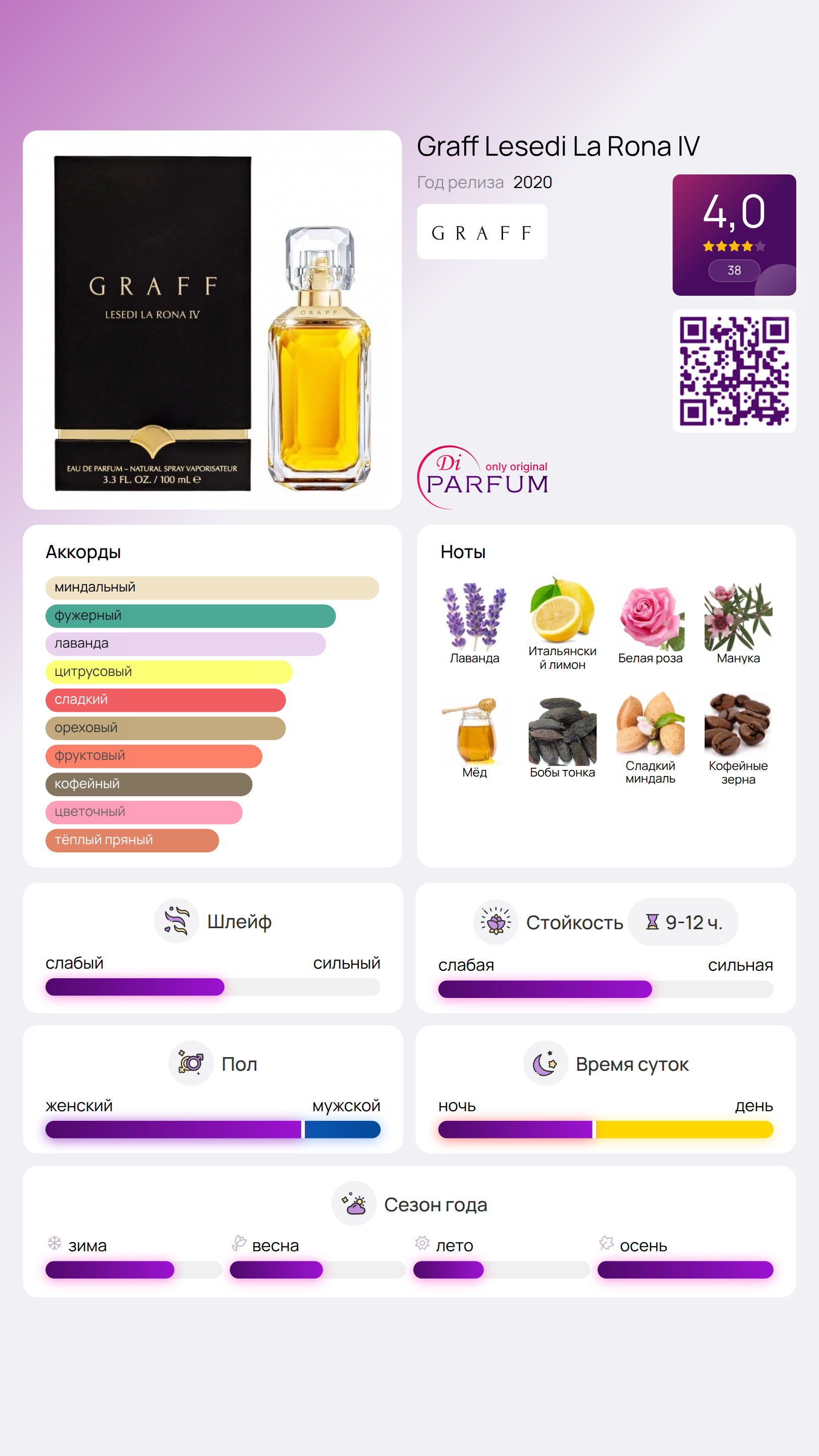 Lesedi La Rona IV от Graff — это восточно-восточный гурманский аромат для женщин, который был представлен в 2020 году. Автором данного парфюма является парфюмер Стивен Нилсен. В верхних нотах композиции чувствуются нежная лаванда, итальянский лимон и белая роза, которые создают светлый и свежий старт. Сердце аромата наполнено сладостью мануки, медом и экзотическими бобами тонка, а завершает композицию тёплый и уютный шлейф из сладкого миндаля и кофе.