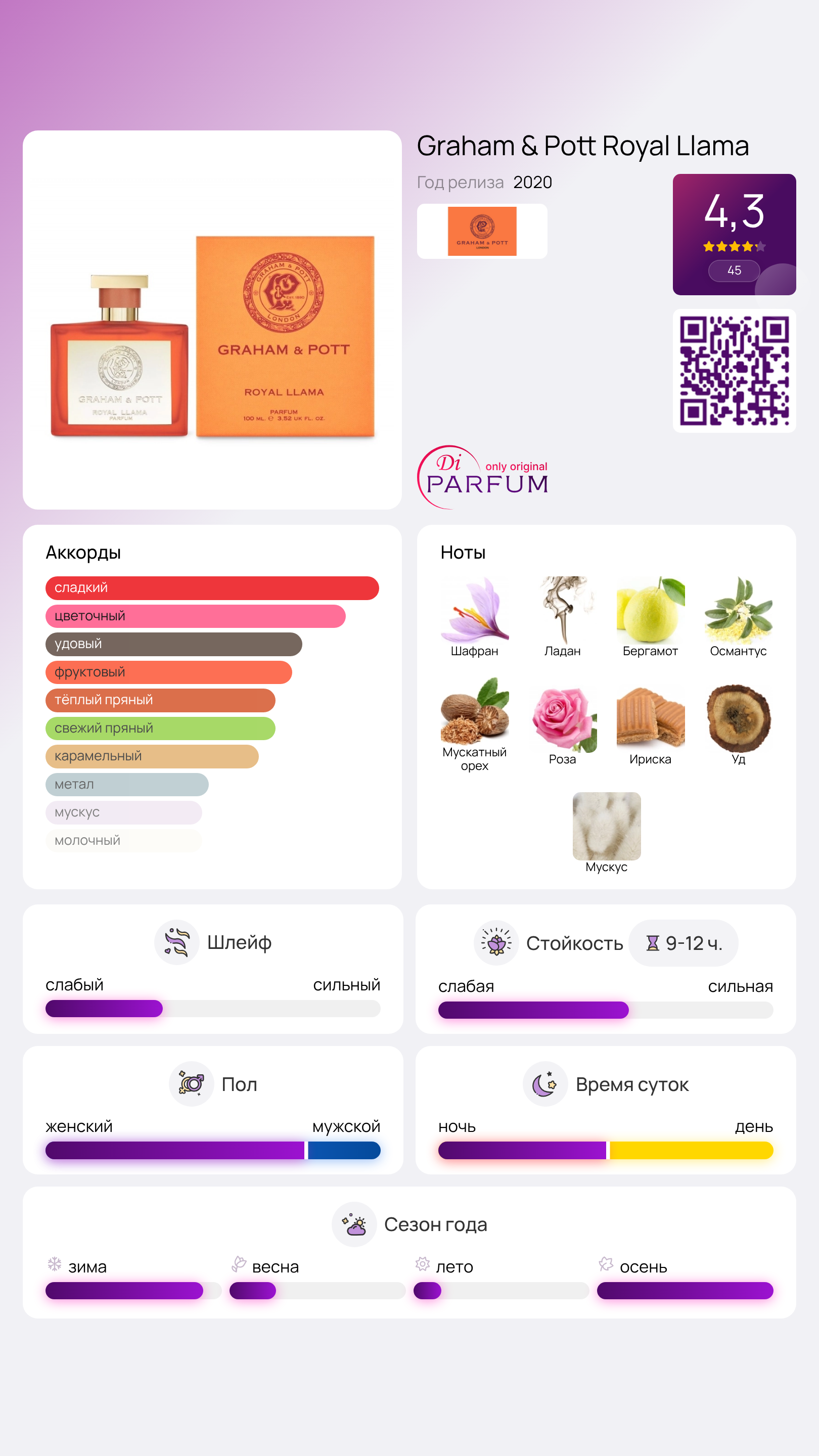 Композиция Royal Llama от Graham & Pott преображается с изменением сезонов благодаря восточным и гурманским элементам, сохраняя дух новаторства. Она вызывает ассоциации с дорогой тканью, состав которой включает 60% шерсти ламы и 40% шелка. Флакон имеет массивную форму, украшен золотистой крышкой с логотипом известного бренда из ОАЭ, а упаковка в тыквенных оттенках напоминает солнечный свет, отражающийся на плитке.
