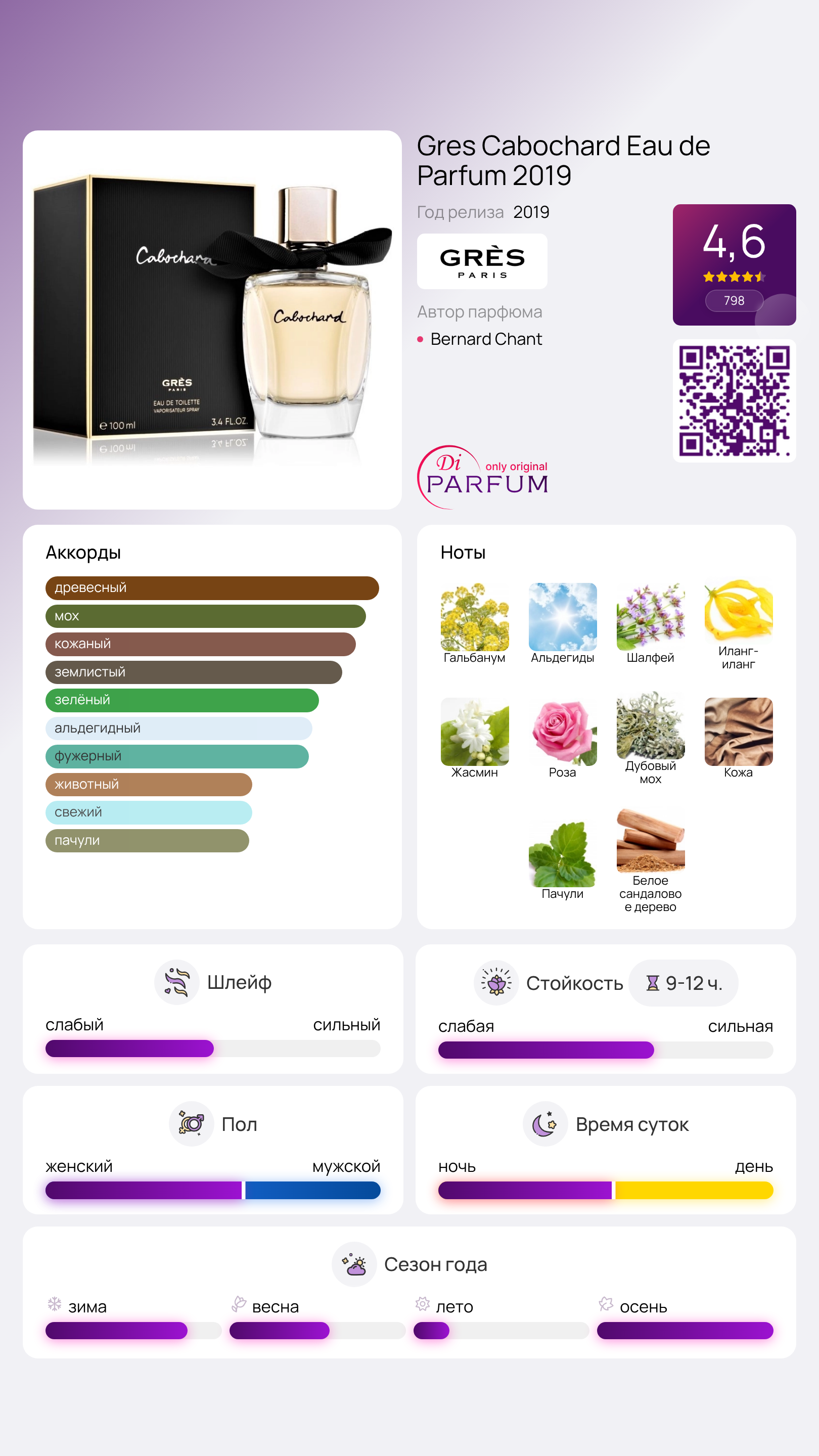 Cabochard Eau de Parfum 2019 от Grès – это шипровый аромат для женщин, который сочетает в себе элегантность и характер. Выпущенный в 2019 году, этот парфюм создан известным парфюмером Бернаром Шантом, который смог воплотить в нём уникальную гармонию нот.