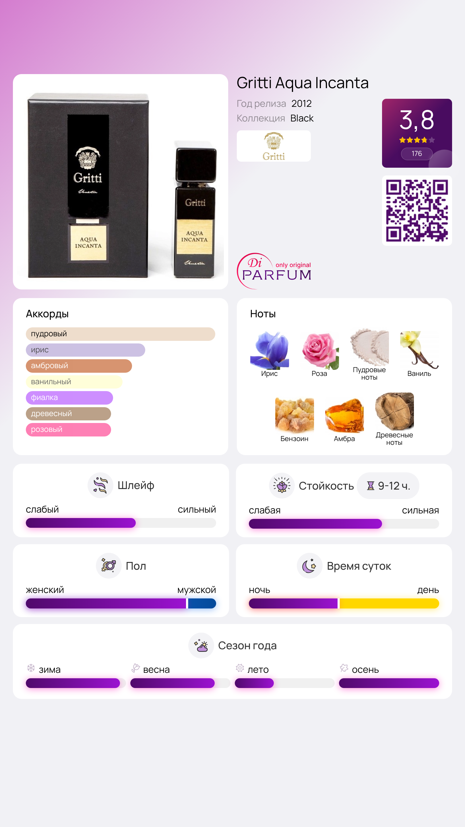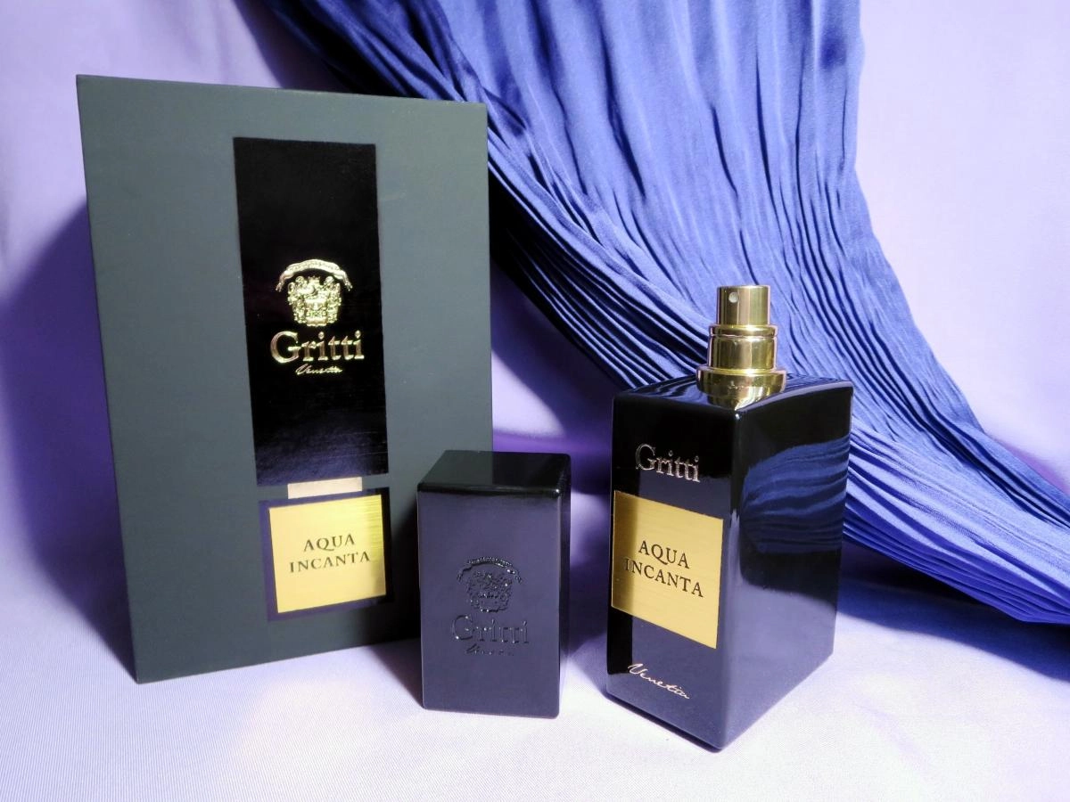 Gritti Aqua Incanta – это утонченный женский парфюм, который был разработан в 2012 году итальянским домом косметики и парфюмерии с историей, уходящей корнями в XVI век, связанным с венецией Гритти. С 2010 года дом старается восстановить древние рецепты парфюма времен Ренессанса. Название Aqua Incanta переводится как «Очаровывающая Вода». Этот аромат представлен в виде духов и входит в серию Black Collection, упаковки которой напоминают о роскошных книгах в черном переплете, рассказывающих свои истории через ароматы.