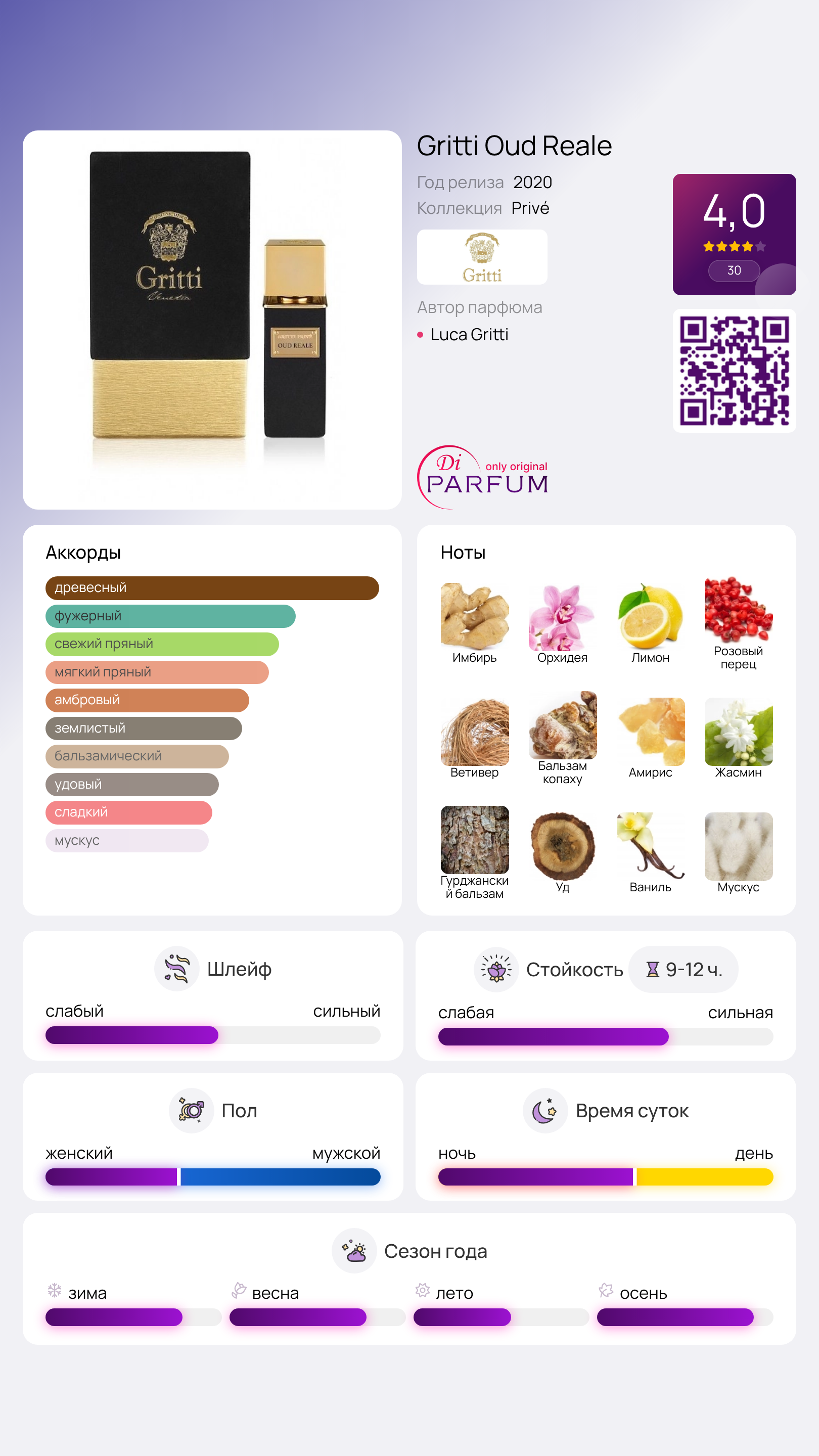 Глубокий и выразительный аромат Oud Reale от Gritti открывает новые грани использования агарового масла, погружая обладателя, будь то мужчина или женщина, в мир восточной магии и тайн. Искусно сбалансированные пропорции эликсира делают его подходящим как для повседневного носки, так и для особого случая. Стильный матово-черный флакон с контрастными золотистыми деталями добавляет шарма и elegance.