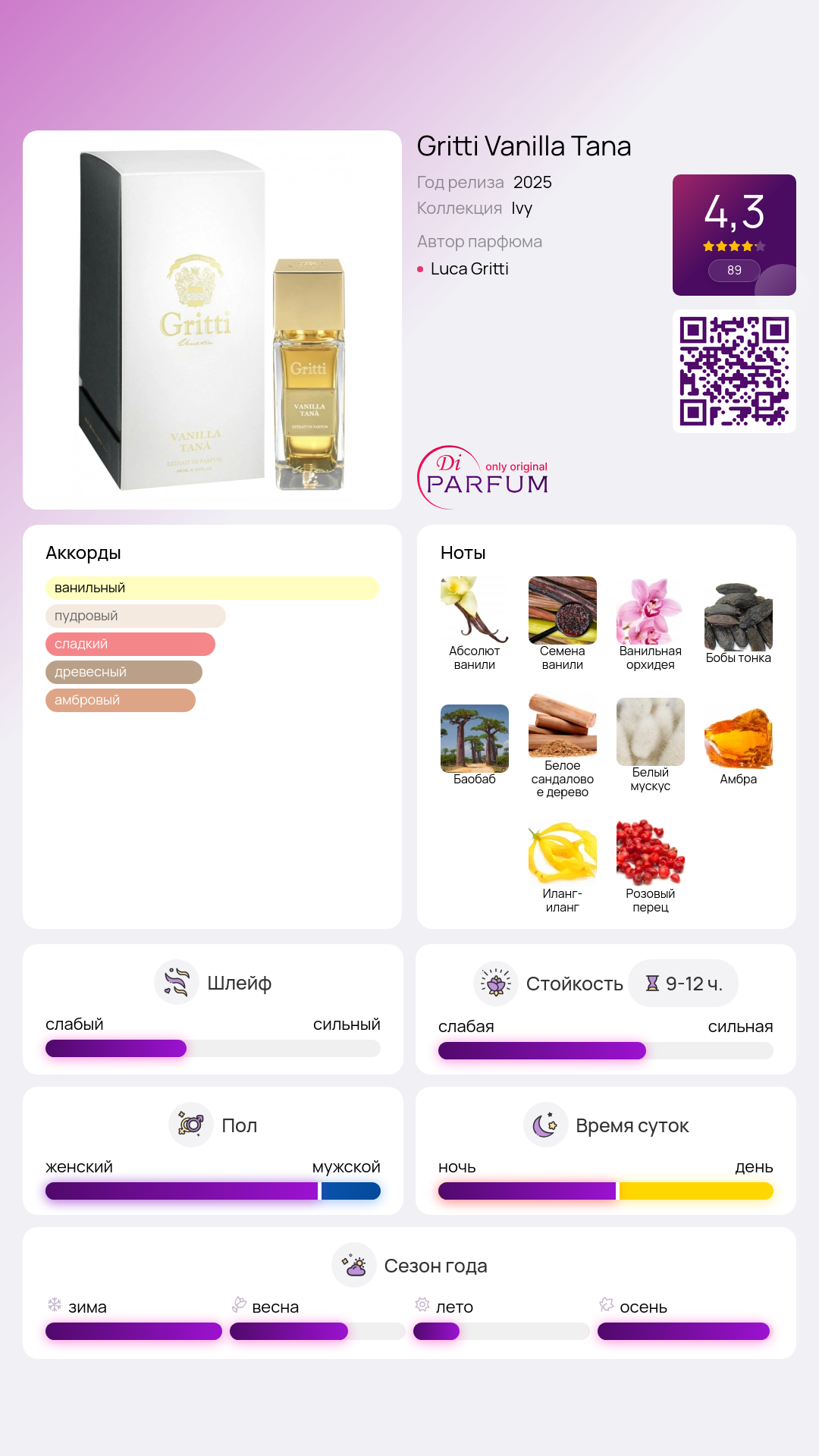 Этот парфюм идеально подойдёт как для повседневного использования, так и для особых случаев, подчеркивая индивидуальность и создавая 'знак отличия' для своего носителя. Если вы ищете аромат, который оставит незабываемое впечатление, Vanilla Tanà – это именно то, что вам нужно.