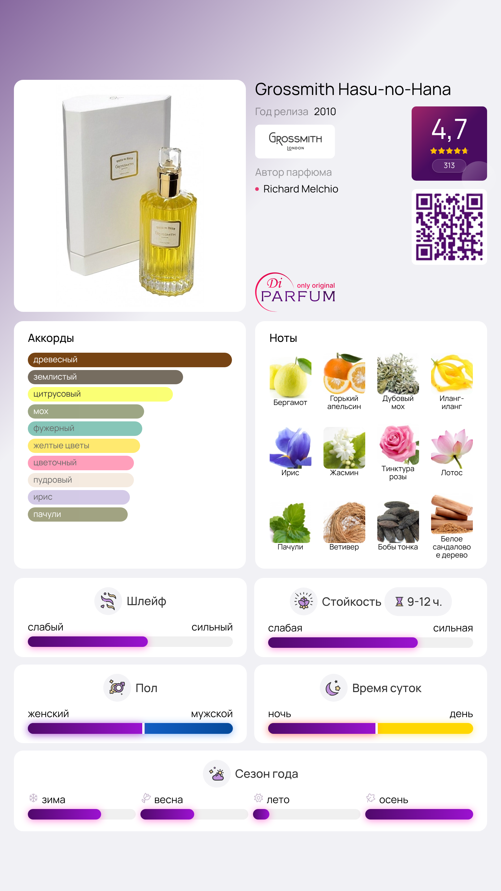 В 2010 году парфюм Grossmith Hasu-no-Hana стал настоящим открытием, продемонстрировав, как изысканный шипровый аромат может гармонично сочетаться с чувственной оболочкой, оформленной в восточном стиле. Его строгий и винтажный флакон привлекает внимание — классическая форма и четкие линии намекают на то, что этот аромат не легкомысленный и игривый, а представляет собой сложную и самодостаточную композицию. Носить его — значит прожить его, ощущая каждый аккорд.