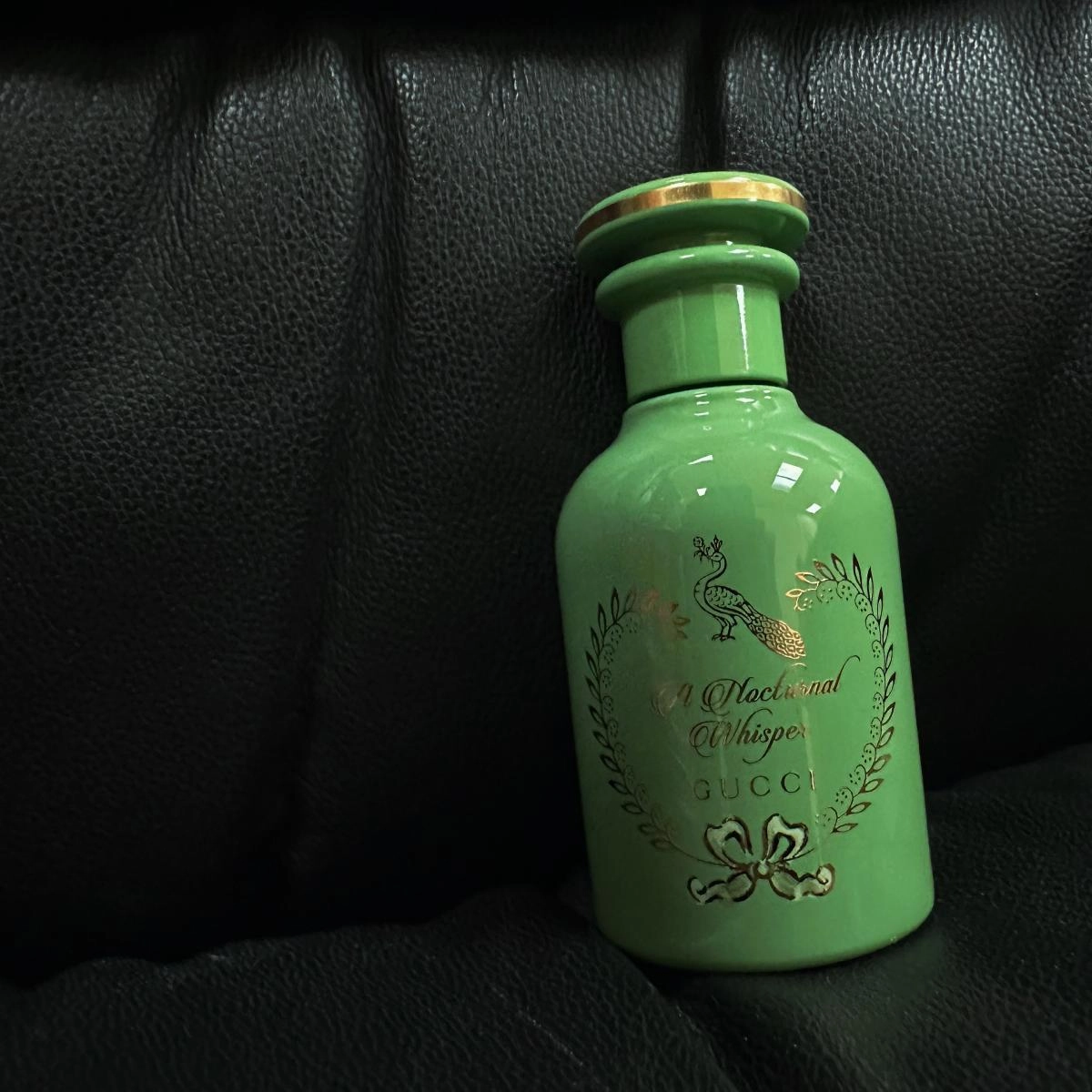 GUCCI A Nocturnal Whisper — это изысканное дыхание ветра, ощутимое только для вас. Роскошный флакон, украшенный золотыми узорами, напоминает о великолепии природы. Лакированная поверхность флакона серо-фисташкового цвета, сделанная из стекла, выглядит как мрамор. Форма емкости вызывает ассоциации с древними аптекарскими бутылочками, которые когда-то стояли на полках, и снабжена стеклянным аппликатором.