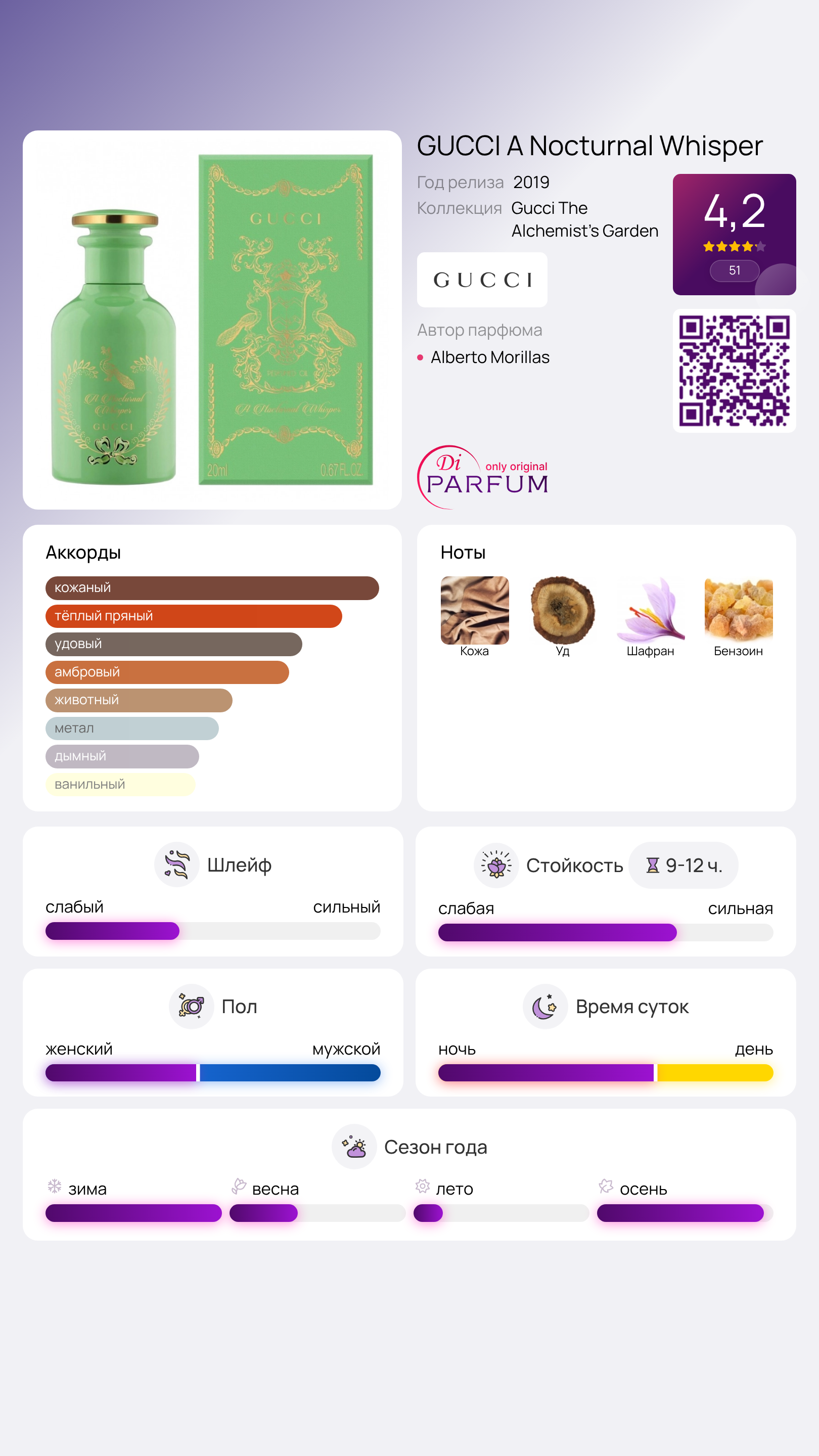 Основу композиции составляет пленительная свежесть шафрана, которой удачно дополняют мягкие, анималистические нотки кожи. Вкусовые ощущения раскаленного уда сливаются с чистыми сердечными аккордами, создавая магическую атмосферу. Бензоин с его смолисто-ванильным оттенком добавляет глубокие контрасты чувств и эмоций.