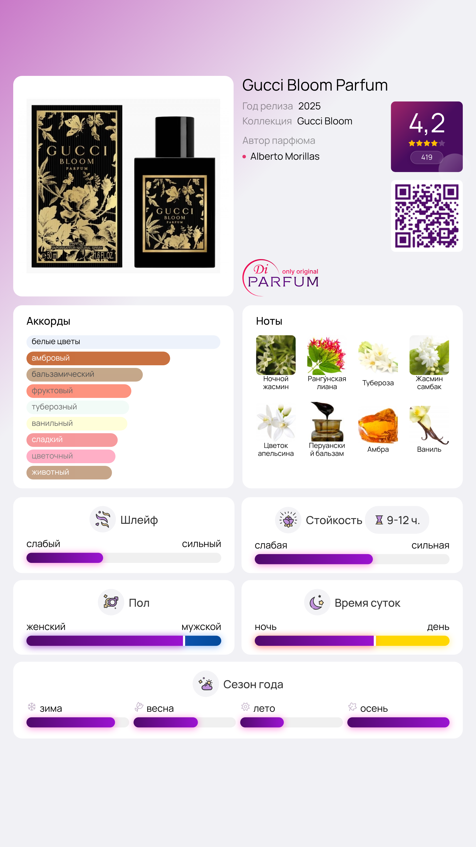Gucci Bloom Parfum от Gucci - это восточно-цветочный аромат для женщин, который вобрал в себя всю прелесть цветущего сада. Этот новый парфюм был представлен в 2025 году и создан известным парфюмером Альберто Мориасом.