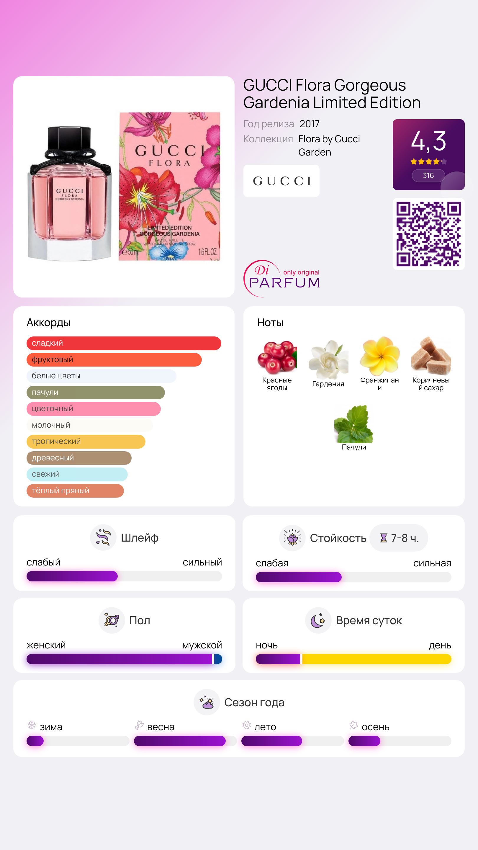 Красные ягоды играют важную роль в начале музыкальной композиции аромата, заполняя его свежестью и энергией. В сердце парфюма гармонично соединяются гардения и франжипани. Наконец, сладость раскрывается в базе, где доминируют ноты коричневого сахара в сочетании с пачули. Аромат проявляет свою полную силу именно в вечернее время, когда он звучит наиболее эффектно.