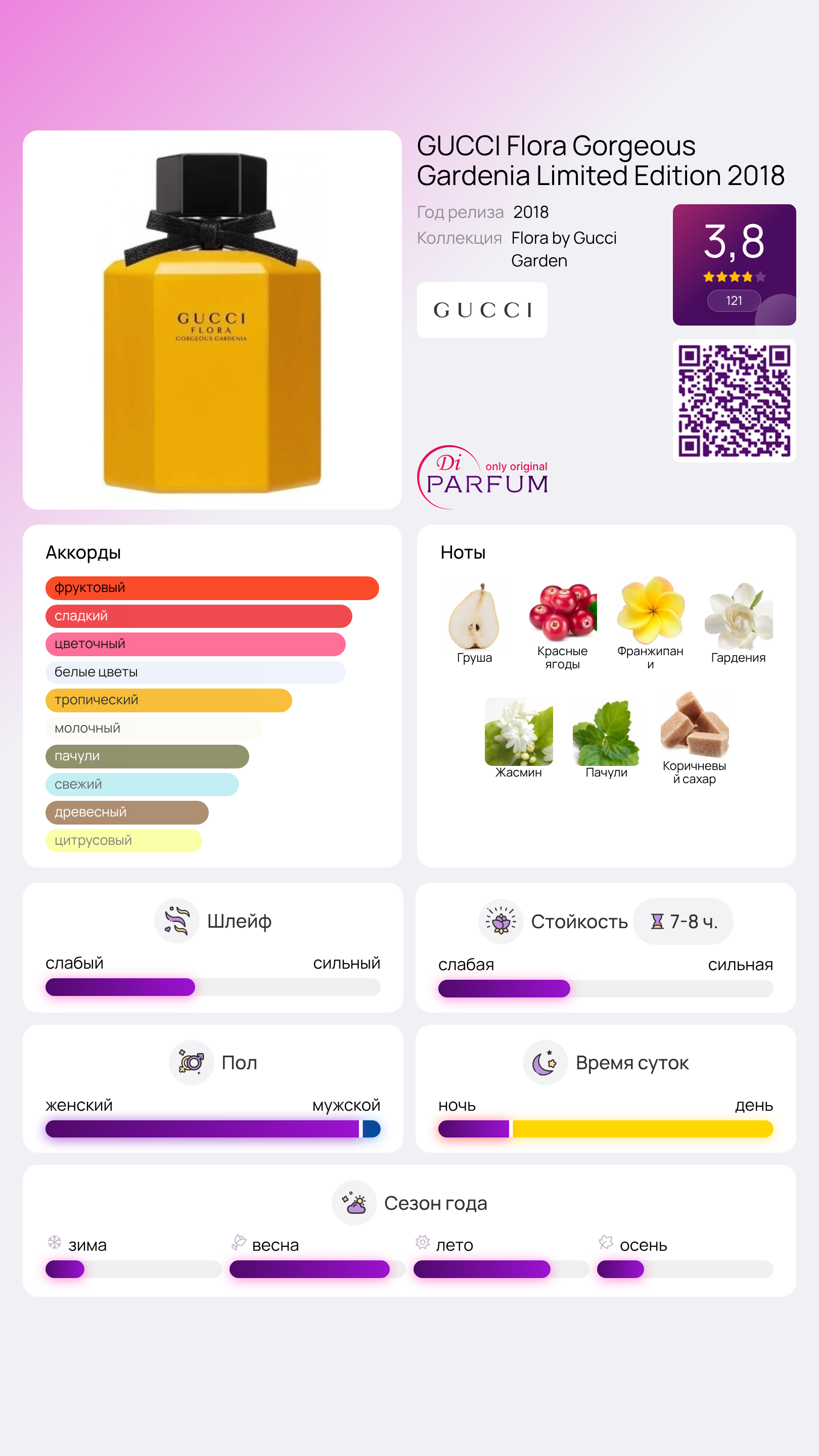 Flora Gorgeous Gardenia Limited Edition 2018 от Gucci — это цветочно-фруктовый аромат для женщин, который был представлен в 2018 году. Верхние ноты включают в себя аромат груши и красных ягод, в сердце находятся франжипани, гардения и жасмин, а базу составляют пачули и коричневый сахар.