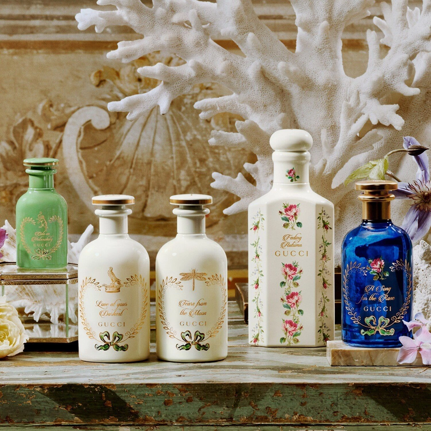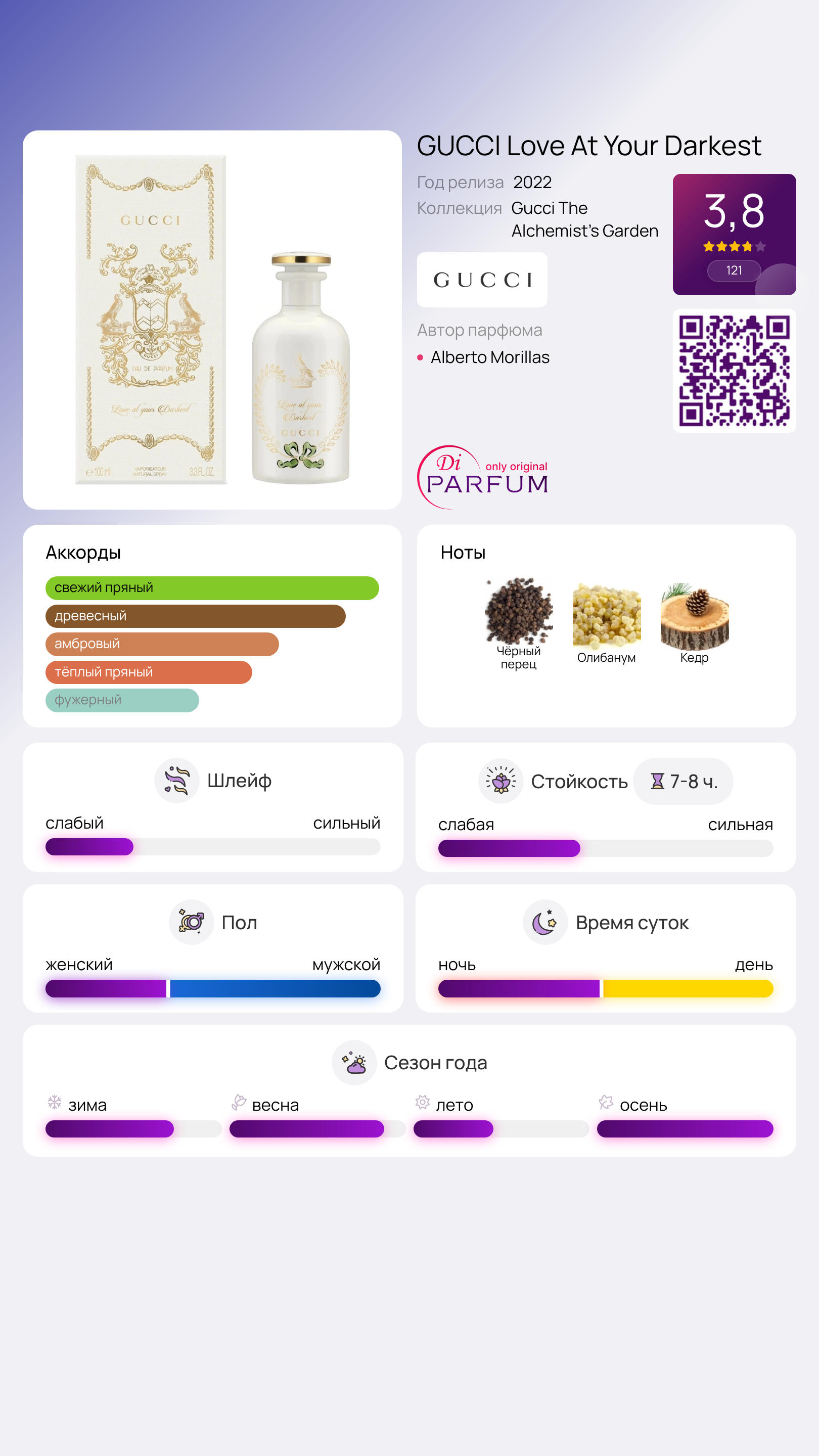 Парфюм Love At Your Darkest от GUCCI стал одной из новинок 2022 года и участвует в линейке «Сады алхимиков» The Alchemist’s Garden. В его составе использованы ключевые компоненты, характерные для знаменитого итальянского бренда. Элегантный флакон изготовлен из стекла с эмалевым покрытием и украшен золотым принтом с изображением королевского сокола, зелёного банта и лиственного венка.