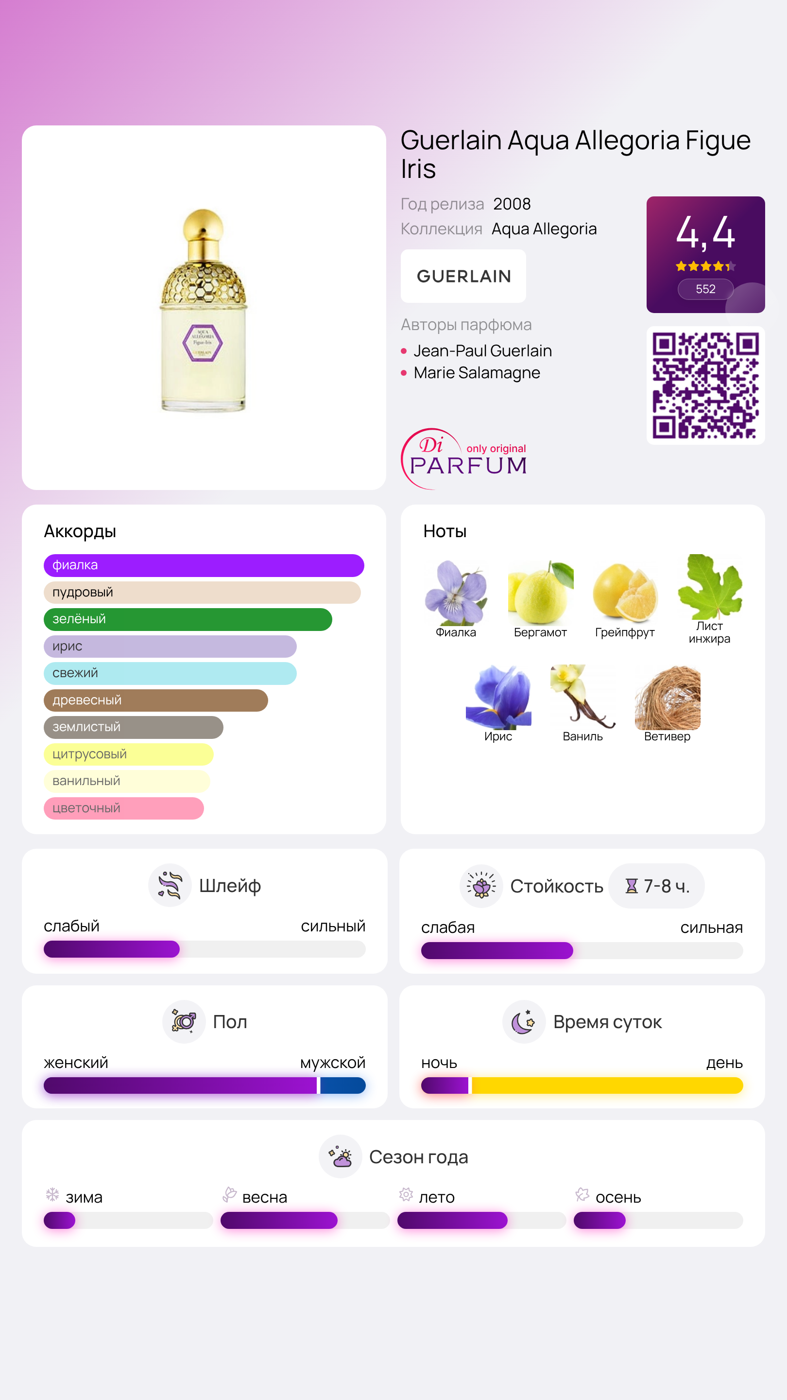 Aqua Allegoria Figue Iris от Guerlain Parfum - яркий аромат сочетания цветов и фруктов, передающий радостные фантазии. Элегантный ирис в сочетании с сладким инжиром в этой превосходной композиции символизируют теплоту летних дней. Аромат игривый, привлекательный и очаровательный, будто тонизирующий коктейль, который оживляет чувства и подчеркивает изысканность. В верхних нотах звучат грейпфрут и бергамот, а в "сердце" - инжир, ирис и фиалка. Базовые ноты включают ветивер и ваниль.