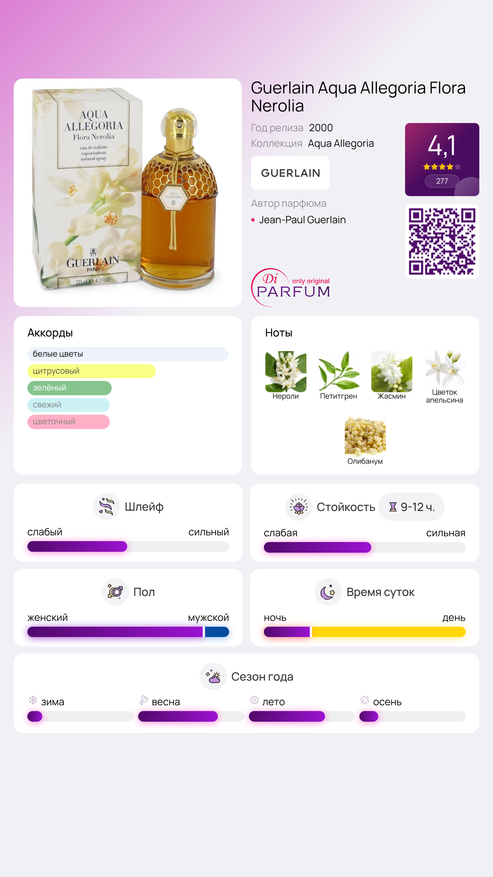 Aqua Allegoria Flora Nerolia от Guerlain — это цветочный аромат для женщин, который был представлен в 2000 году. Его создателем является известный парфюмер Jean-Paul Guerlain. В верхних нотах аромата раскрываются свежие акценты нероли и петитгрейна, в сердце звучат утонченные жасмин и апельсиновый цвет, а в качестве базы используется смола олибанума, придающая композиции глубину и изысканность.