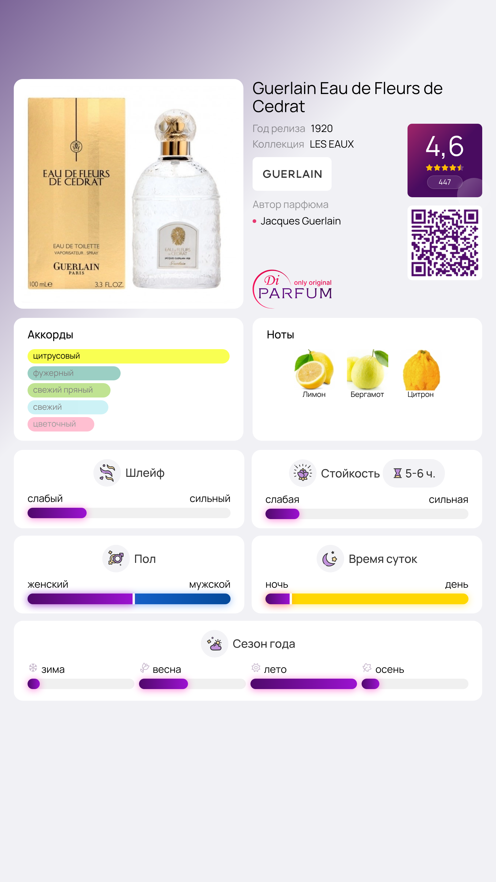 Жак Герлен (Jacques Guerlain) воплотил свои воспоминания о проведенном на побережье отпуске в аромате Eau de Fleurs de Cedrat, созданном им в 1920 году. Этот парфюм легко сочетает в себе свежесть и тонкость, как будто загадочную чувственность средиземноморского воздуха. В его композиции чувствуются основные ноты кедра, лимона и вербены, делая аромат чистым и ясным.