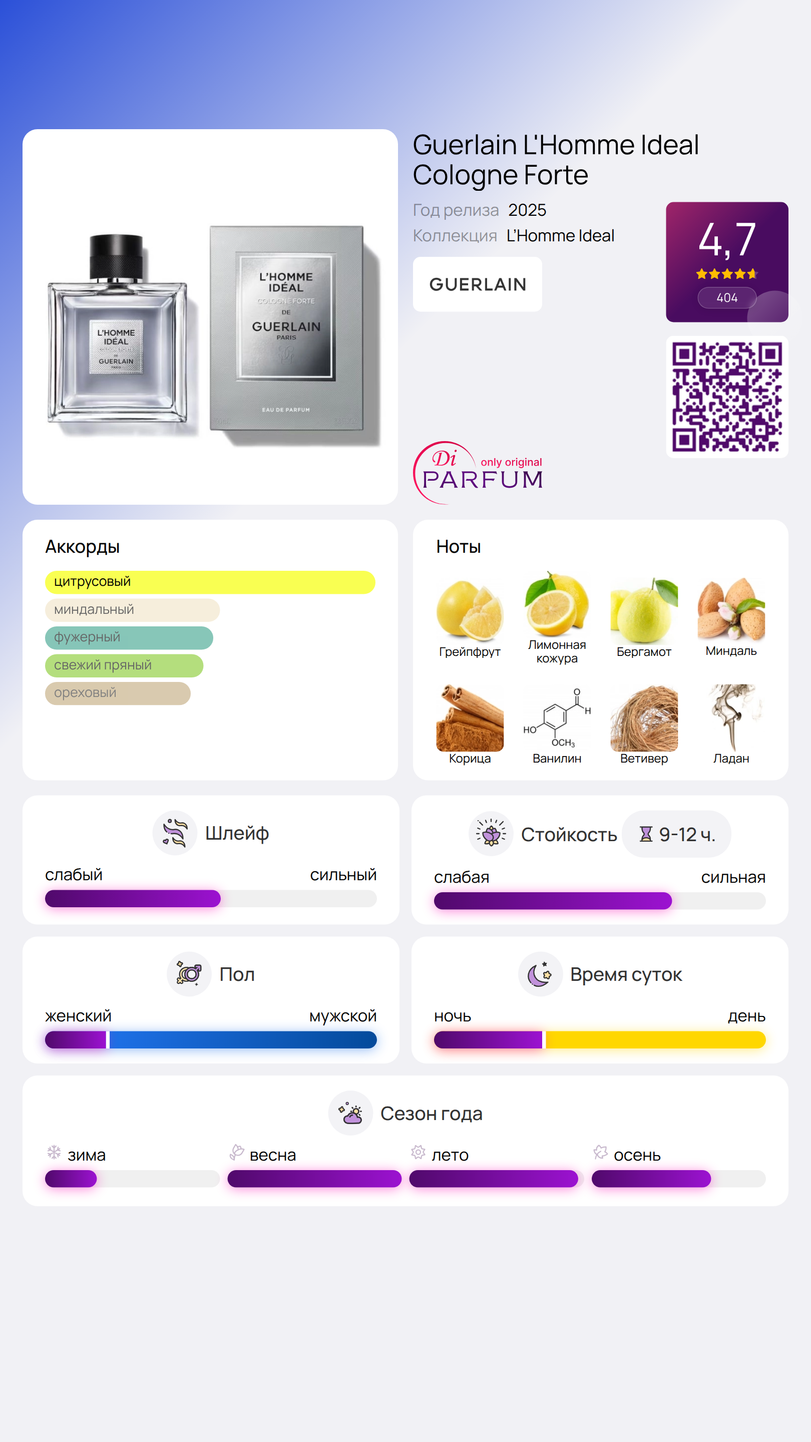 L'Homme Idéal Cologne Forte от Guerlain — это новый мужской аромат, который был представлен в 2025 году. За его создание отвечает талантливый парфюмер Delphine Jelk, создавшая уникальное сочетание нот, которое подчеркивает характер современного мужчины.