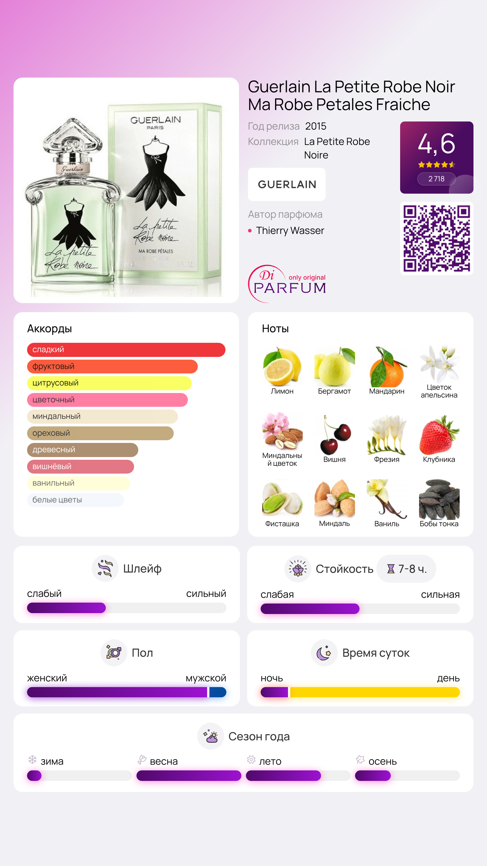 La Petite Robe Noire Ma Robe Petales Fraiche - это свежий парфюм для женщин от Guerlain Parfum, выпущенный в 2015 году, который призван добавить немного беззаботности и бодрости в повседневную жизнь. С его освежающими цитрусовыми нотами мандарина и бергамота, начало этого аромата вдохновляет на игривые забавы. Стойкий сердечный аккорд звучит ярко и насыщенно благодаря фрезии, миндальному цветку, жасмину самбак, турецкой и болгарской розе. И завершает эту композицию мягкий сладкий шлейф из фисташковых нот, мускуса, пачули и тонка бобов, который окутывает своим теплом и нежностью.