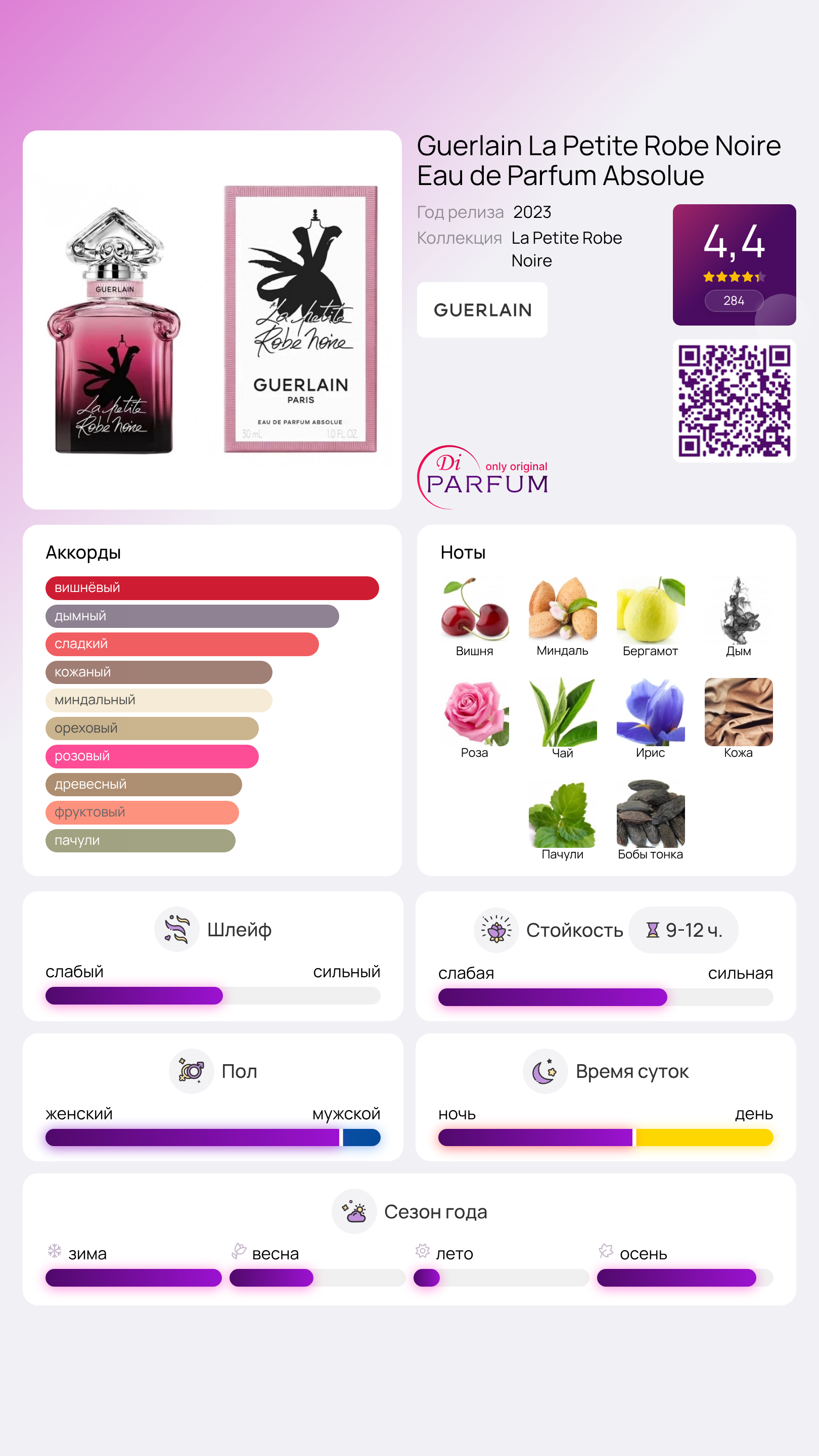 Ода элегантной розе, вышитой древесными пачулями – такова пленительная цветочно-фруктовая формула аромата Guerlain La Petite Robe Noire Eau de Parfum Absolue. Вдохновленный стилем парижанок, этот интенсивный фланкер олицетворяет радость жизни и страсть цитрусовой терпкости, розовых лепестков и дымного шлейфа. Бобы тонка, ирисовая пудра и кожаные аккорды дополняют уникальный аромат, созданный культовым французским брендом Guerlain в 2023 году. Фирменный флакон, окрашенный в черные и розовые оттенки, символизирует романтику Парижа и заботу о окружающей среде, включая пчел.