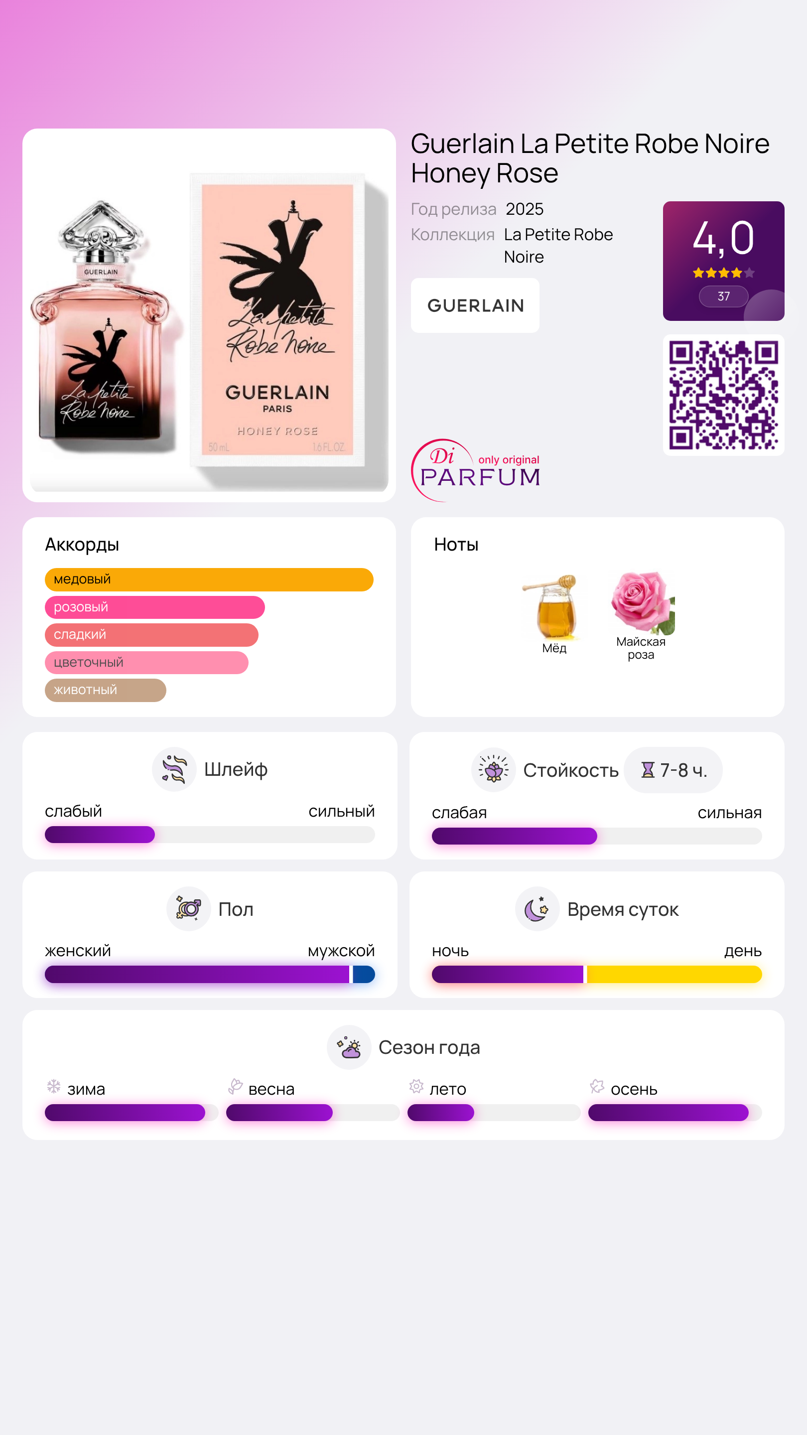 La Petite Robe Noire Honey Rose от Guerlain – это новый цветочно-фруктовый гурманский аромат для женщин, который был представлен в 2025 году. Эта парфюмерная композиция является частью знаменитой коллекции La Petite Robe Noire, известной своей утонченностью и чувственностью.