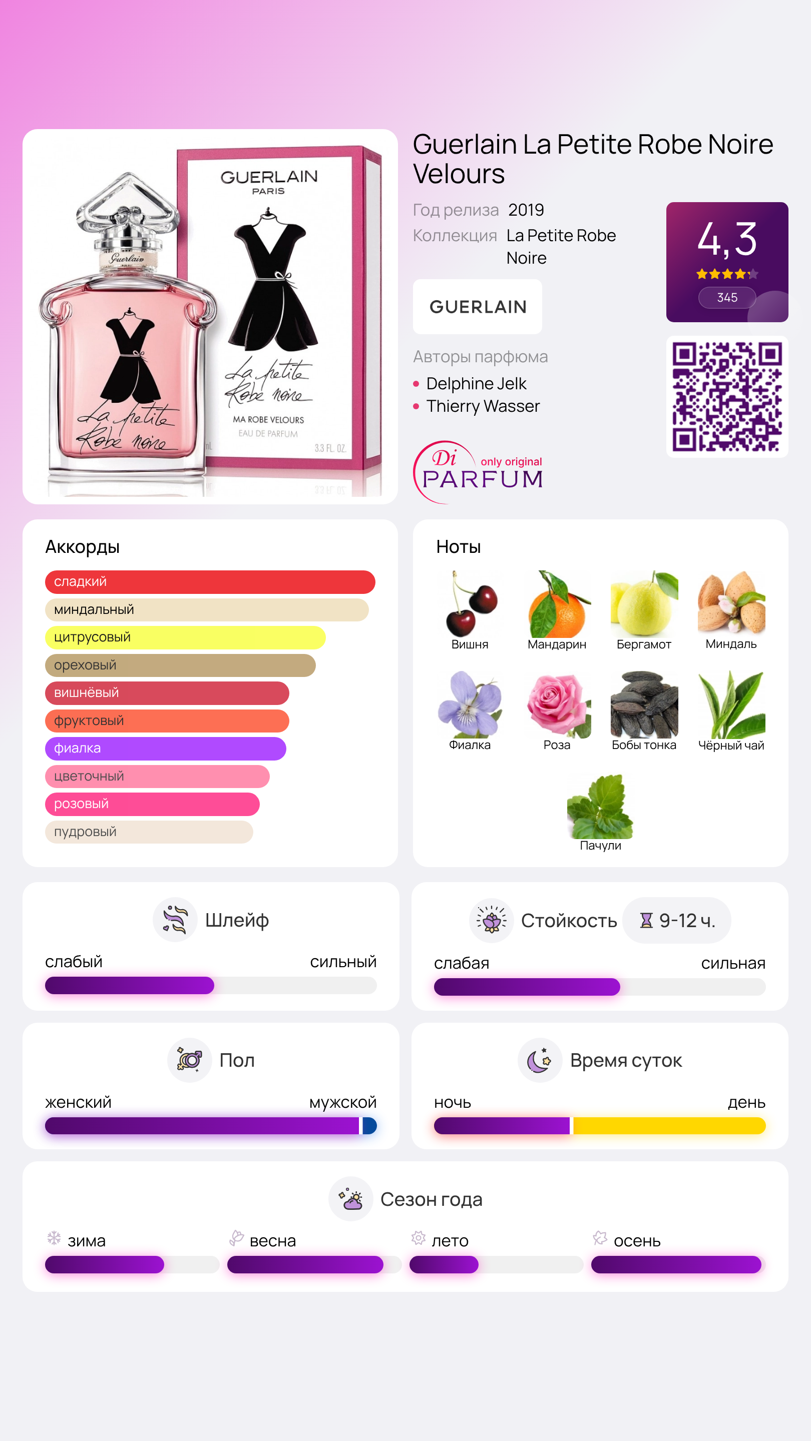La Petite Robe Noire Velours от Guerlain - это классическая фруктово-цветочная композиция с современными акцентами. Начальные ноты раскрывают цитрусово-ягодное трио с оттенками сочной вишни, спелого мандарина и терпкого бергамота. В сердце аромата доминирует королева цветов - роза, дополненная изящной фиалкой и ароматным миндалем. Завершает композицию стойкий шлейф из экзотических бобов тонка, пачули и пряных нот чая.