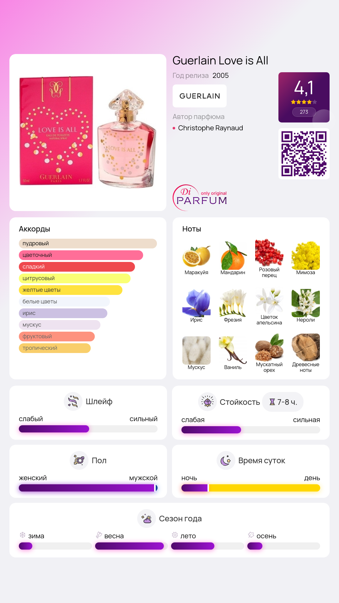 Бренд Guerlain не перестает удивлять своих поклонников романтическими ароматами, посвященными темам любви и нежности. Одним из новейших творений весенней коллекции стала Love is All, созданная в духе изысканности и подлинной женственности. Этот свежий и захватывающий букет ароматов вдохновлен привлекательной девушкой, стремящейся к счастью и открыто исповедующей свои чувства, прекрасно понимая, что смысл ее бытия заключен в настоящей и неповторимой любви. В композиции присутствуют ноты отличительного мандарина, розы и листьев орешника. В сердце аромата раскрываются мимоза, ирис и цветы апельсинового дерева. Шлейф аромата завершают ноты кедра, амбры и сандала.