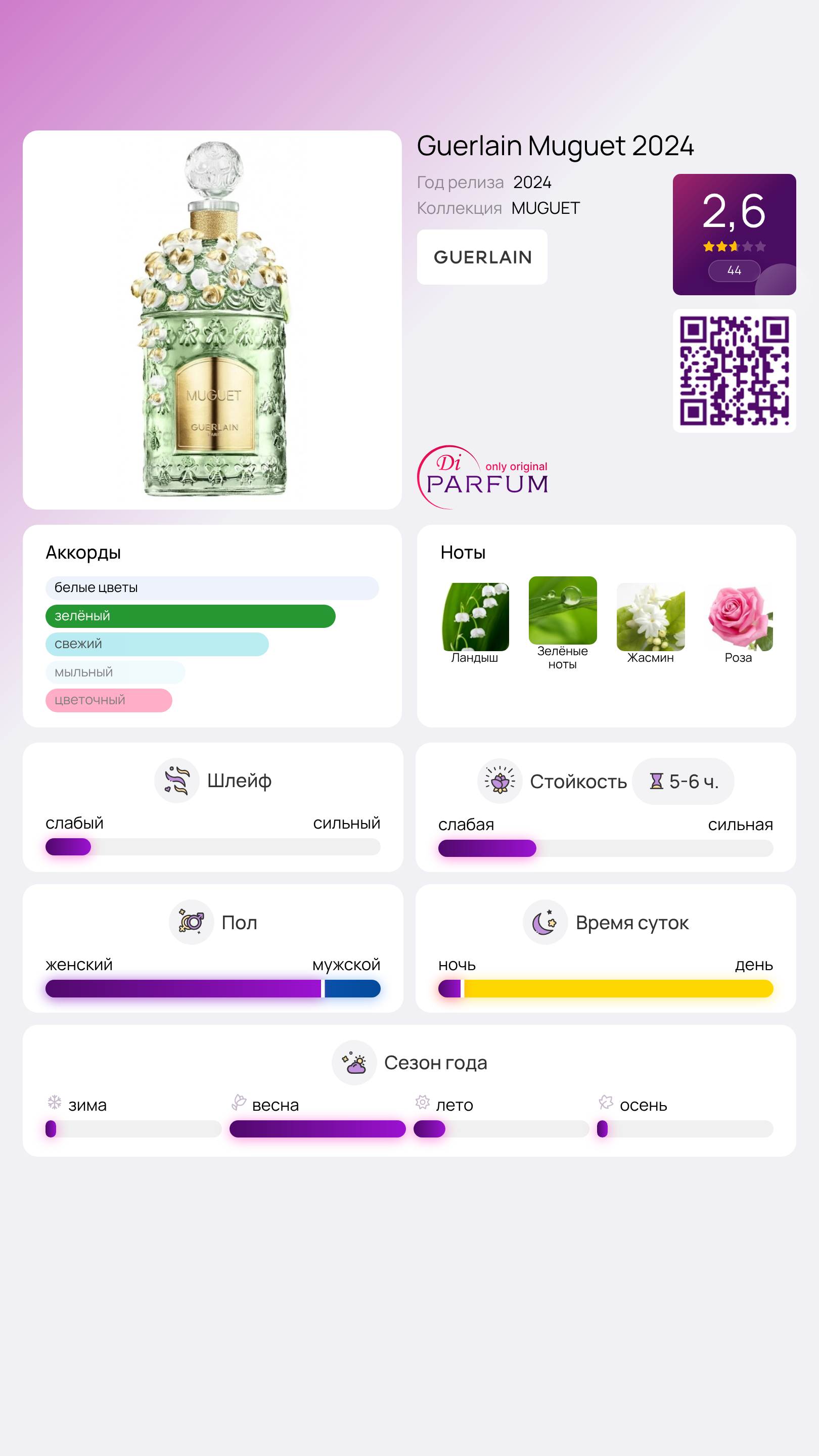 Основные ноты аромата включают в себя ландыш, зеленые ноты, жасмин и розу, что придаёт ему свежесть и лёгкость. Ландыш с его нежным и искристым запахом сочетает в себе свежесть весенних дней, а зеленые ноты добавляют ощущение своей свежести и природного благородства. Жасмин, как символ чувственности и женственности, обогащает композицию своей сладостью, а роза придаёт элегантности и утонченности.