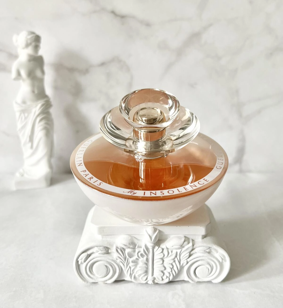 После успеха аромата Insolence модный дом Guerlain решил порадовать поклонниц новой версией под названием My Insolence. Этот женский парфюм отличается нежными и сочными оттенками цветов и фруктов. Он придает ощущение легкости, внутренней уравновешенности и уверенности благодаря композиции сладкой малины, чувственного жасмина, цветов горького миндаля, пачули, бобов тонка и нот ванили. Флакон выполнен в виде трех полусфер в розово-белой гамме, сохраняя форму оригинала.