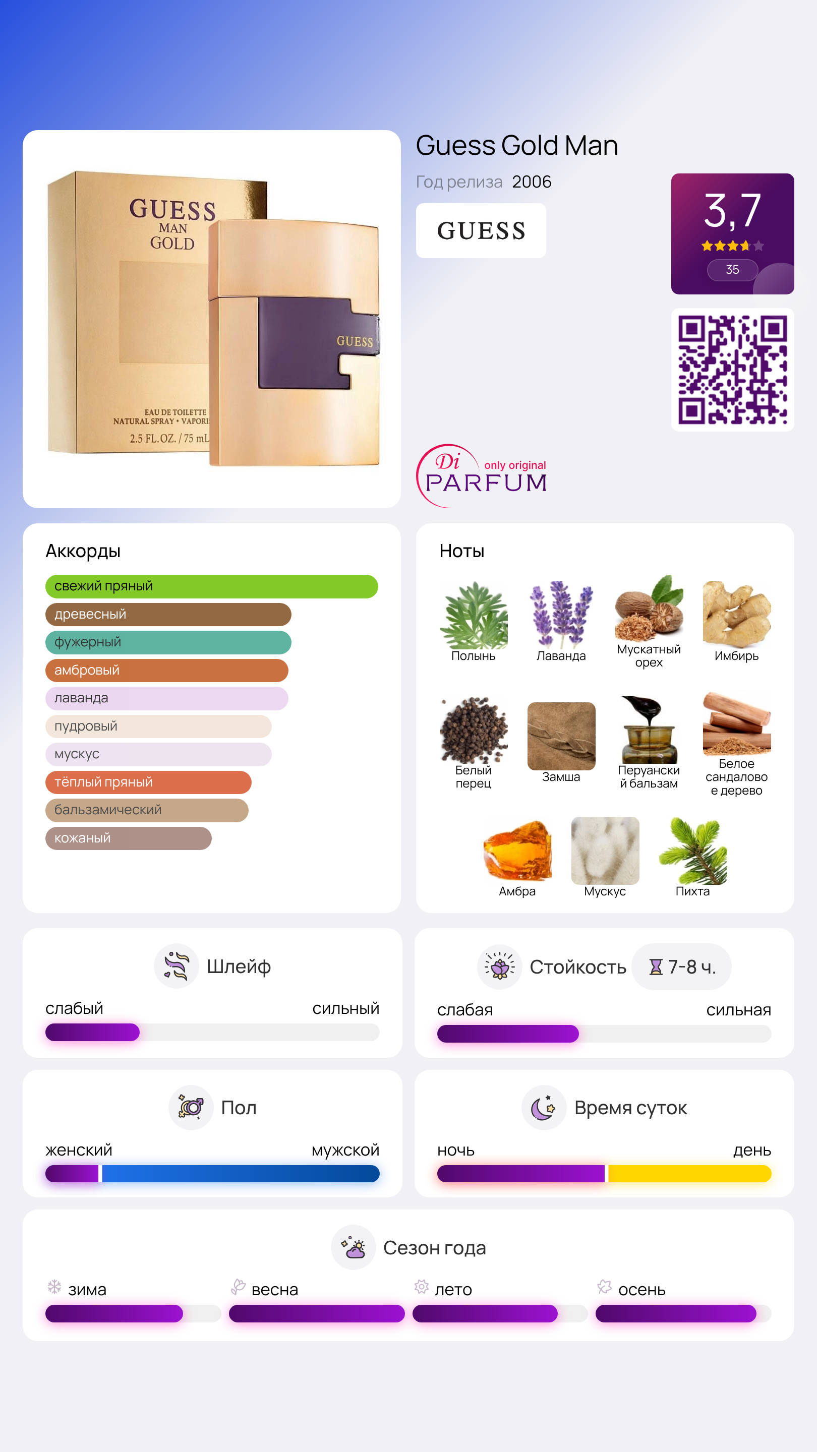 Аромат Guess Gold Man представляет собой гармоничное смешение лучших качеств мужчин из различных культур: восточной страсти, африканской энергии, европейской рассудительности и американского духа свободы.