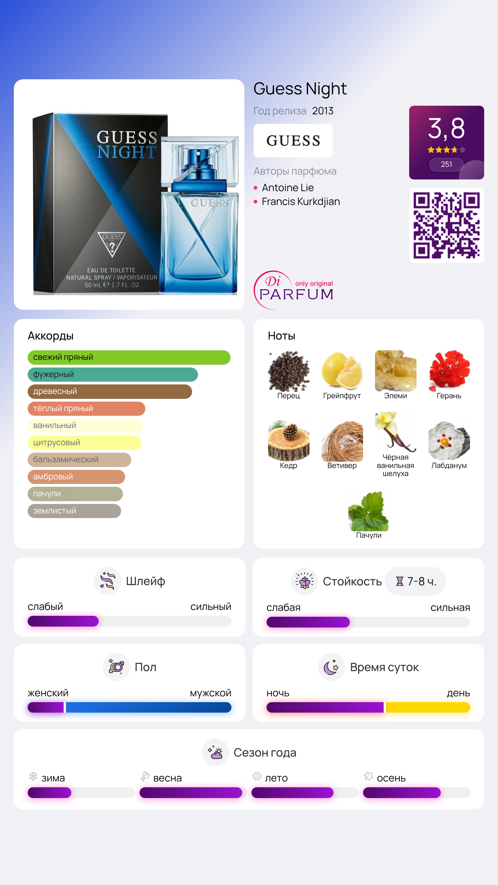 В 2013 году бренд Guess представил поклонникам электронной и танцевальной музыки мужской парфюм Guess Night. Создание аромата стало результатом работы мастеров Antoine Lie и Francis Kurkdjian, которые вложили в него все свое мастерство. В начале композиции ярко выделяется жгучий черный перец в сочетании с элеми и грейпфрутом.