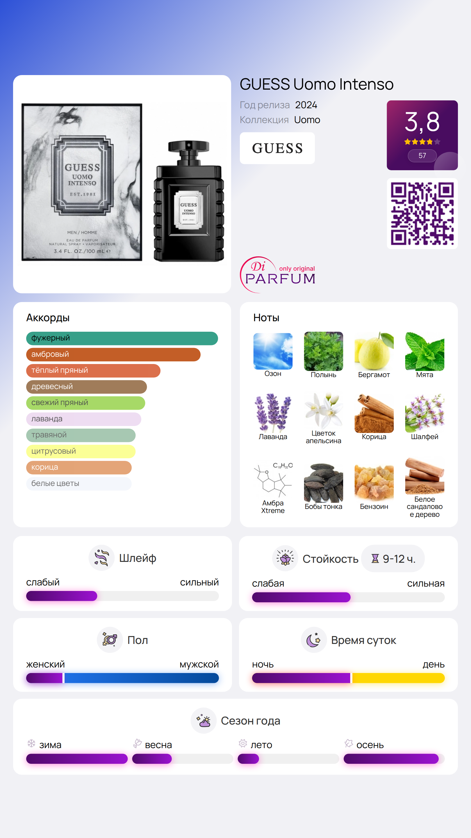 Guess Uomo Intenso — это аромат для мужчин, которые ценят стиль и элегантность. Доступен в объемах 30, 50 и 100 мл Eau de Parfum, он станет идеальным дополнением к вашему образу и подчеркнёт вашу индивидуальность.