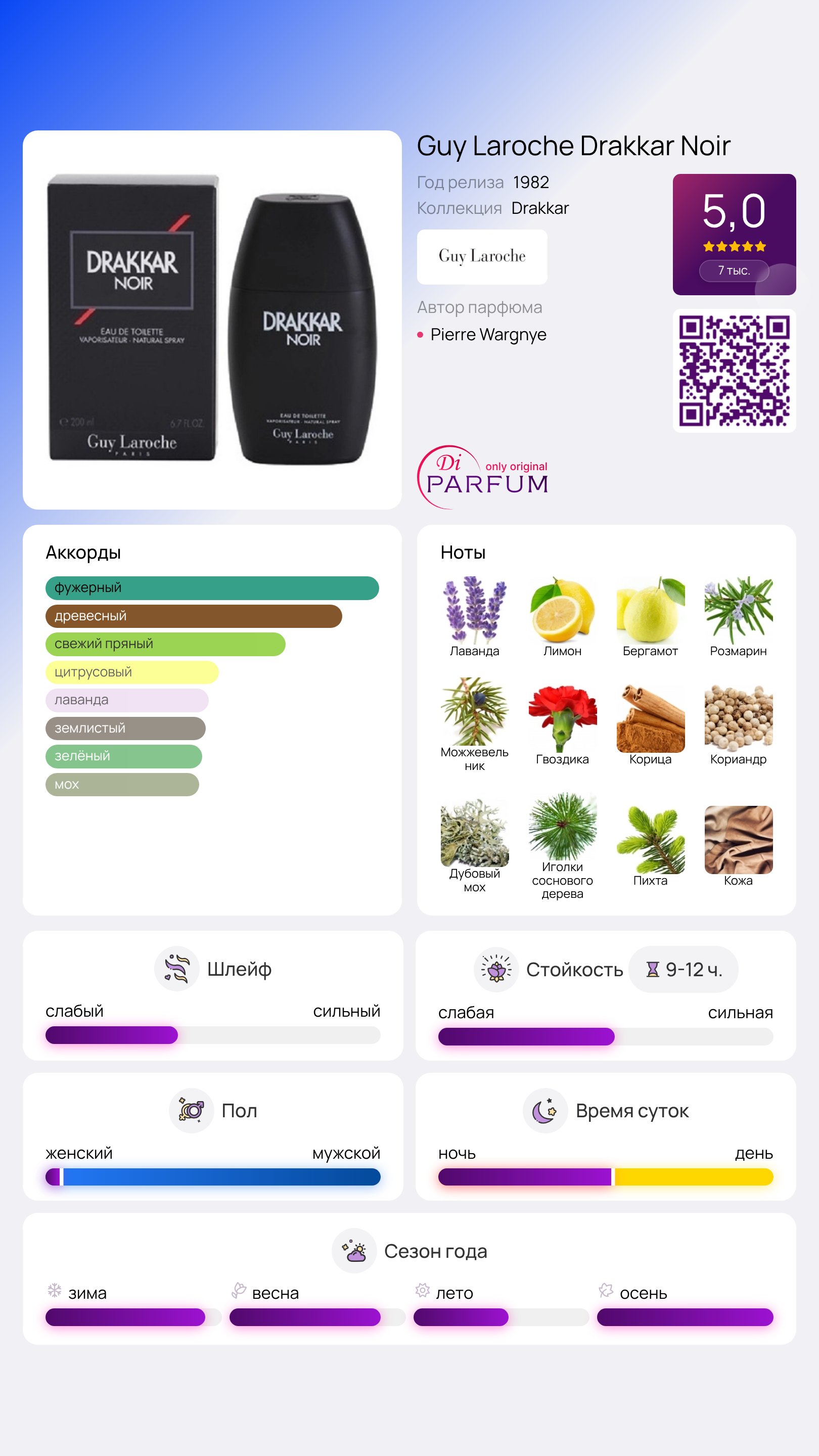 Современный мужчина отличается благородством и чувственностью, которые переплетаются в необычных чертах его характера, отражающих свежесть и разнообразие вкусов аромата Drakkar Noir от Guy Laroche. Древесные ноты в этом аромате олицетворяют изысканность и простоту, а также силу, напоминая о том, что каждый джентльмен может выступить в роли защитника, укрывая невинную девушку от ненастья.