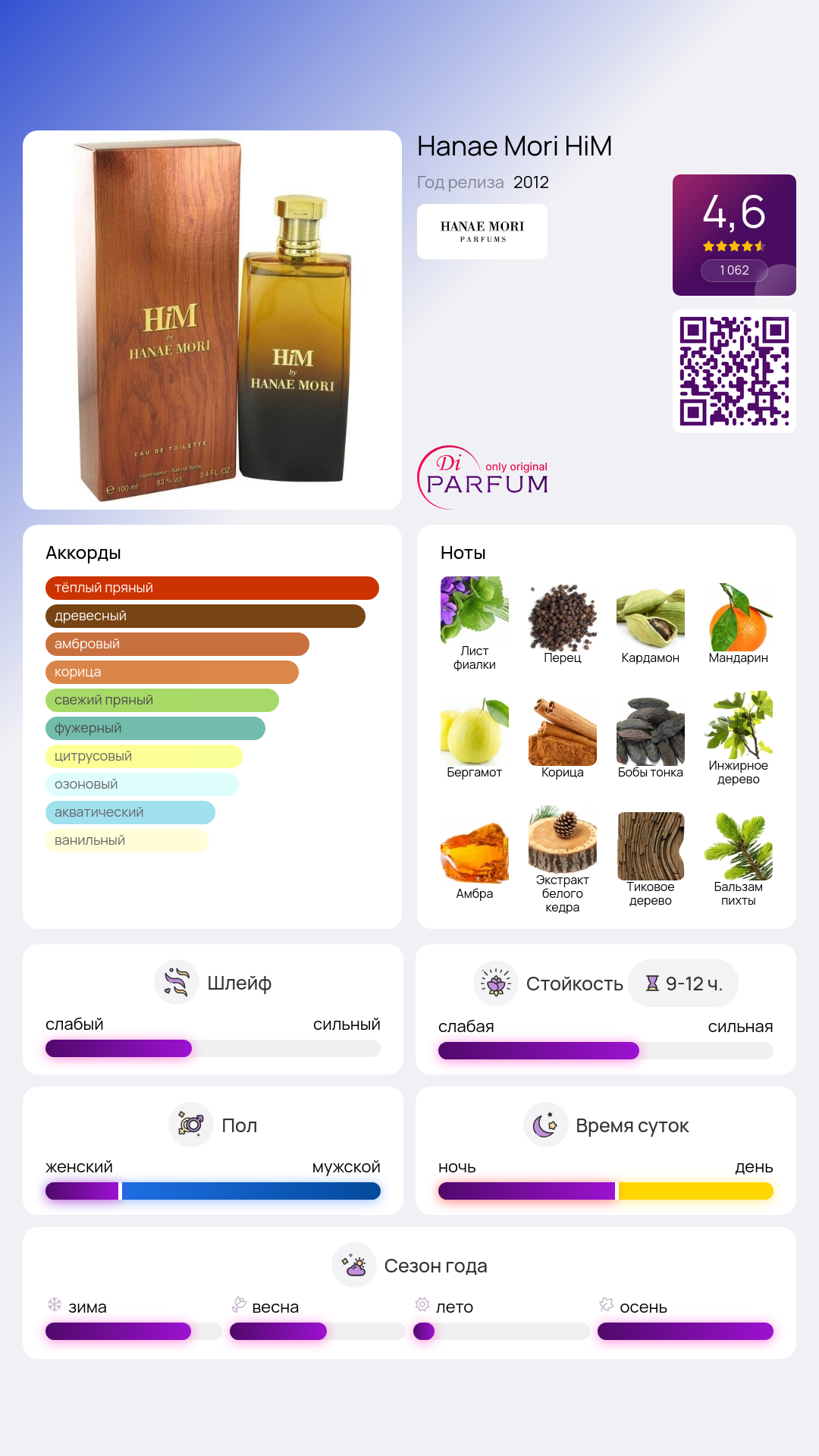 Аромат HiM пробуждает в себе чувства романтики, силы и позитива. Его ноты не являются эфемерными, они известны и понятны многим. В композиции присутствуют мандарин, кардамон и корица. Их гармонично дополняют аккорды пихтового бальзама, белого кедра, перца и тонка бобов.