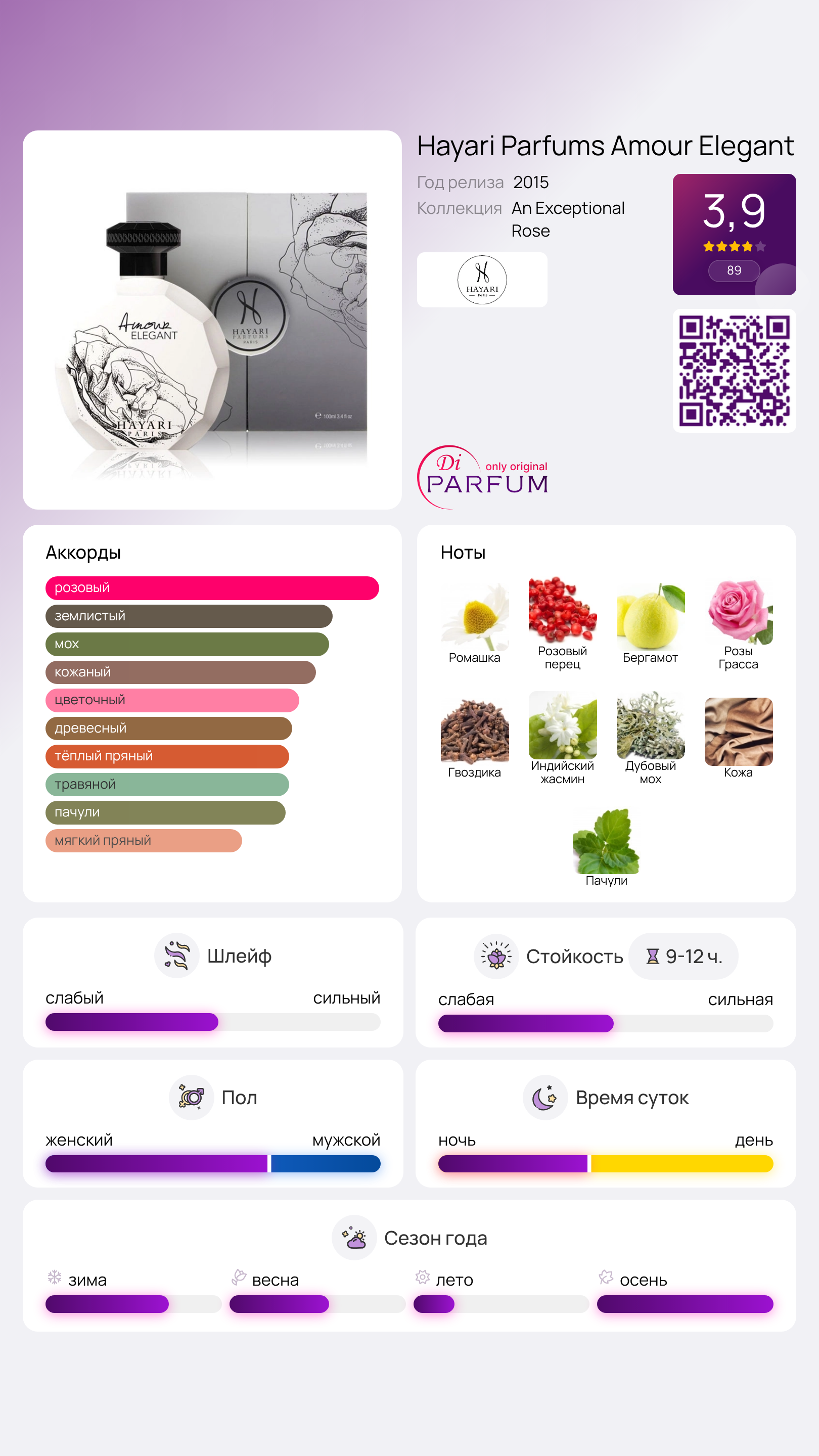 Amour Elegant от Hayari Parfums — это шипрово-цветочный аромат, предназначенный как для женщин, так и для мужчин. Выпущенный в 2015 году, он быстро завоевал популярность благодаря своей утонченности и гармонии нот.