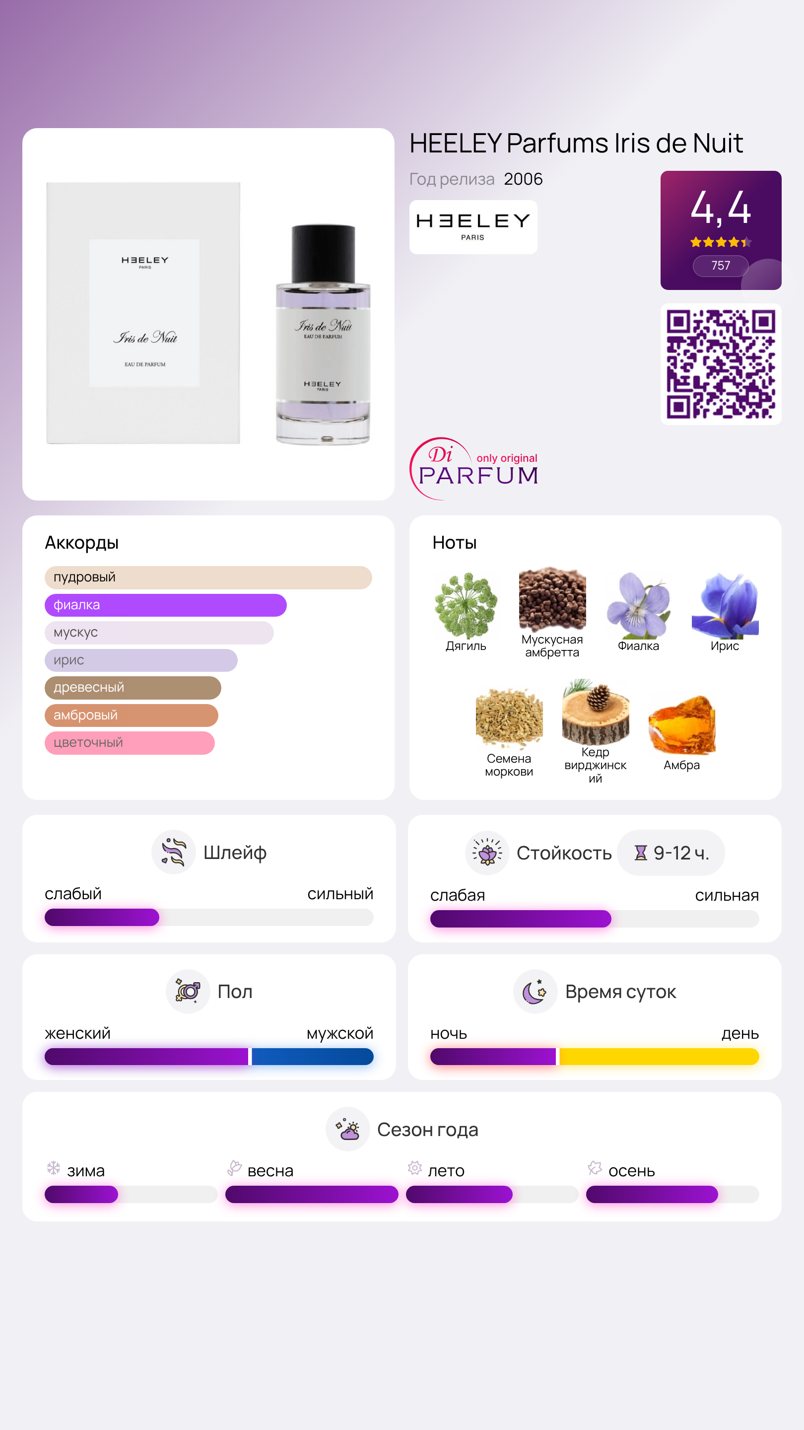 Амбретта и ангелика легким касанием проходят мимо верхних нот, растворяясь в сердечных аккордах фиалок, ириса и семян моркови. Основу композиции составляют амбра и виргинский кедр, создавая надежный фундмент. Шлейф аромата, обладающий неземной красотой, легкий, пудровый и акварельный, долго окутывает своих обладателей нежным облаком Iris de Nuit.
