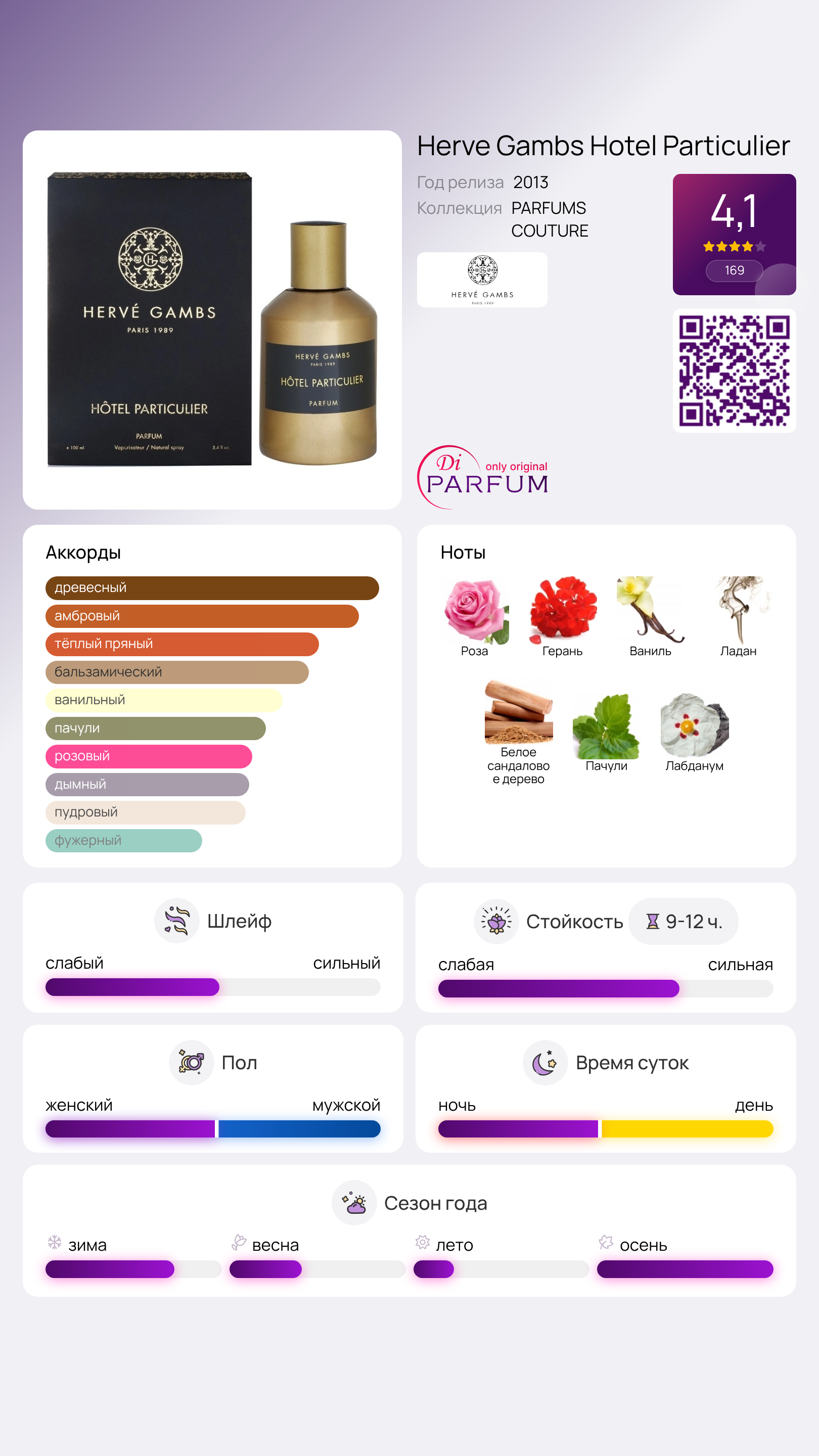 Одним из таких творений является аромат Hotel Particulier, который характеризуется бальзамическими, теплыми пряными и ванильными нотами. Уникальное начало, в котором переплетаются ноты герани и розы, привлекает внимание к этому парфюму.