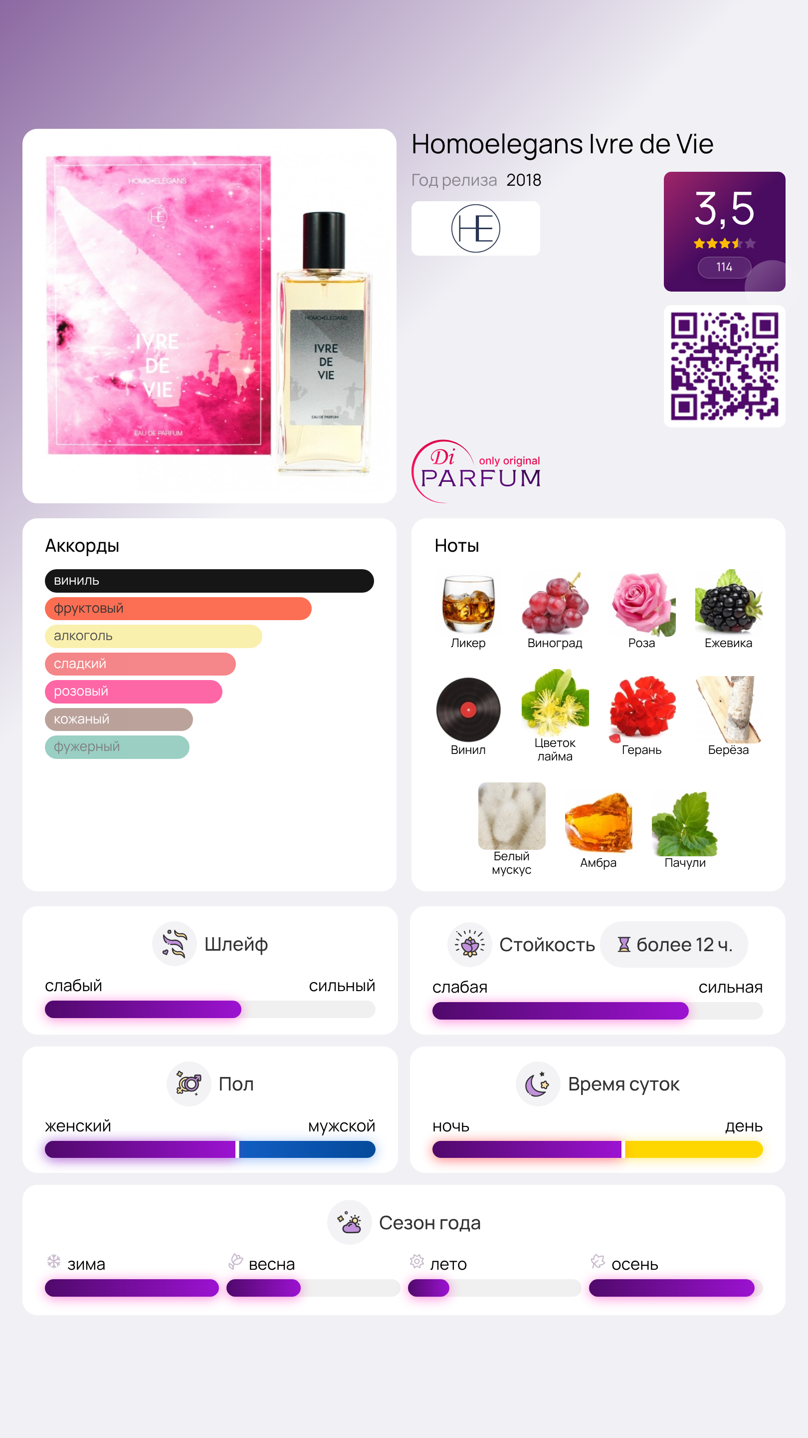 Ivre de Vie от Homoelegans — это уникальный универсальный аромат, который прекрасно подходит как для женщин, так и для мужчин. Выпущенный в 2018 году, он стал настоящим открытием для любителей необычных парфюмов. Верхние ноты аромата сочетают в себе сладкий ликер, спелый виноград, нежную розу, сочную ежевику и свежие листья черной смородины. Сердце аромата наполняют ноты винила, розы, цветков липы и герани, создавая гармоничное звучание. Завершают композицию богатые базовые ноты березы, белого мускуса, амбры и пачули.